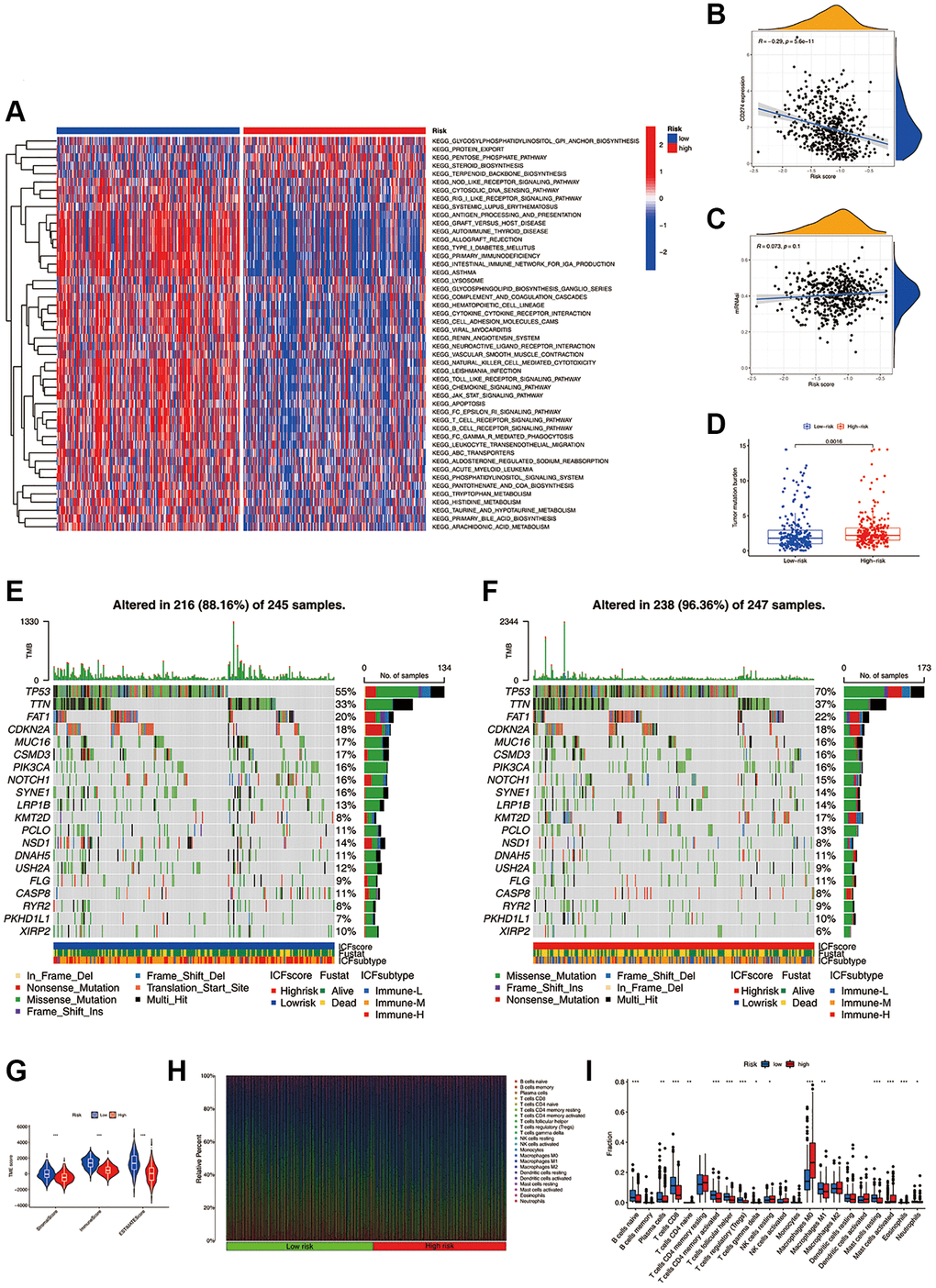 GSVA was conducted to investigate the molecular mechanisms (Figure 4A). In the high-risk group, pathways such as the biosynthesis of glycosylphosphatidylinositol-anchored proteins (GPI-APs), protein export, and pentose phosphate were significantly enriched. In the low-risk group, pathways of immune activation and immunodeficiency, such as antigen presentation processing and primary immune deficiency, were significantly enriched. The expression of most inhibitory immune checkpoints was found to be negatively correlated with the ICF score (Figure 4B and Supplementary Figure 7). The self-renewal property and therapy resistance of cancer stem cells play a crucial role in the development of malignant tumor phenotypes [14]. However, there was no observed correlation between the ICF score and the cancer stem cell index (Figure 4C). Tumor gene mutation was considered as a prerequisite for immunotherapy. In this study, the high-risk group exhibited a significantly higher TMB compared to the low-risk group (Figure 4D). Survival analysis indicated that the ICF score and TMB had a synergistic effect on prognosis prediction (Supplementary Results and Supplementary Figure 8). Furthermore, somatic variance analysis revealed that the high-risk group had higher frequencies of TP53, KMT2D, and NSD1 mutations compared to the low-risk group (Figure 4E, 4F, and Supplementary Table 6, p < 0.05). We have investigated the correlation between the ICF signature genes and the infiltration of immune cells (Supplementary Results and Supplementary Figure 9).