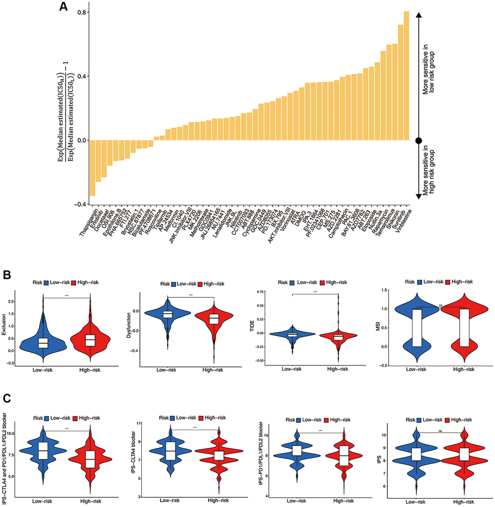 The “pRRophetic” package was employed to estimate the IC50 values of 251 chemotherapeutic/targeted agents in HNSCC patients [15]. The Tumor Immune Dysfunction and Exclusion (TIDE) platform was used to calculate T-cell dysfunction and exclusion scores [16]. A higher TIDE score indicated a greater potential for tumor immune escape and might result in poorer immunotherapy efficacy. Pornpimol et al. developed the immunophenoscore (IPS) based on factors influencing tumor immunogenicity [17]. IPS has been proved to be an ideal predictor for ICIs responsiveness. An increased IPS value was indicative of a higher likelihood of benefiting from ICIs.