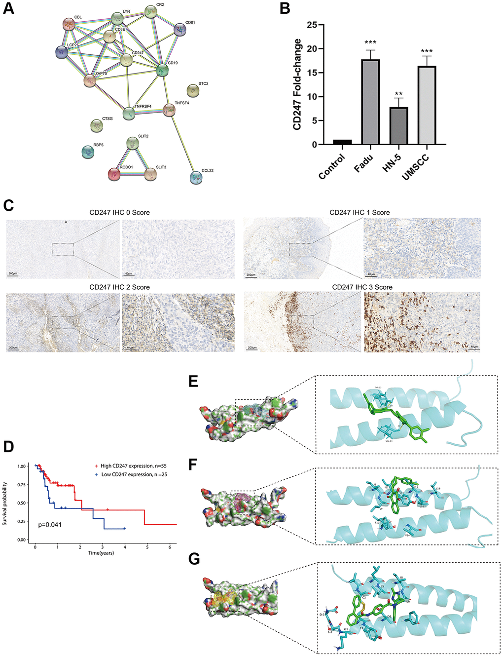 Using the STRING platform, we constructed a protein-protein interaction (PPI) network of the ICF gene signature (interaction score ≥ 0.4, Figure 6A). CD247 was identified as the key target, located at the core of the network. HNSCC cell lines (Fadu, HN-5, and UMSCC) exhibited high expression of CD247 compared to primary oral mucosal epithelial cells (Figure 6B). Immunohistochemical staining was performed on tumor tissues from 80 patients, and the expression of CD247 was scored based on staining intensity (Figure 6C). Our results indicated that patients with high CD247 expression (score 2 and 3) had a more favorable prognosis of survival (Figure 6D), suggesting that CD247 may be a target for tumor immunity in HNSCC and that drugs targeting CD247 could be a potential therapeutic strategy.