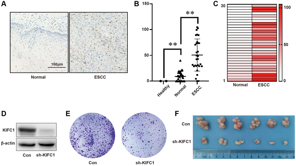 KIFC1 exhibits varying prognostic significance in different tumors; however, its role in esophageal cancer remains unreported. Firstly, we investigated the expression of KIFC1 in ESCC and adjacent tissues using an ESCC tissues CHIP (the tissues CHIPs used in this paper was shown in Supplementary Figure 1). As shown in Figure 1A, in the adjacent tissues, KIFC1 was found to be localized in the cell nucleus, with positive cells predominantly present in the basal layer of the esophageal epithelium, albeit with a very low proportion of positive cells. In cancer tissues, the proportion of KIFC1-positive cells increased, although not all cells exhibited positive staining. This could be attributed to the fact that not all tumor cells undergo mitosis in the cancer tissues. Furthermore, we employed the A.H. scoring method (maximum score of 300) to evaluate the expression levels of KIFC1 in healthy tissues, adjacent tissues, and ESCC tissues. The results revealed a significant increase in KIFC1 scores in cancer tissues compared to adjacent tissues. However, there was considerable variation in KIFC1 expression levels within the cancer tissues (Figure 1B). The paired analysis of KIFC1 protein expression was shown in Figure 1C. We significantly knocked down the expression of KIFC1 using shRNA (Figure 1D). In the cancer tissues, the expression level of KIFC1 was significantly higher than that in adjacent non-tumor tissues, though negative expression samples were also present. At the cellular level, through the clone formation experiment, we found that after transfection of EC109 cells with shRNA plasmid targeting KIFC1, the clone formation ability of EC109 cells significantly weakened (Figure 1E). As expected, the tumorigenic ability of EC109 cells with KIFC1 knockdown in nude mice subcutaneously was greatly reduced (Figure 1F). The results indicate that the expression of KIFC1 significantly increases in ESCC tissues, and the knockdown of KIFC1 could greatly reduce the proliferation capability of tumor cells, potentially having significant prognostic value.