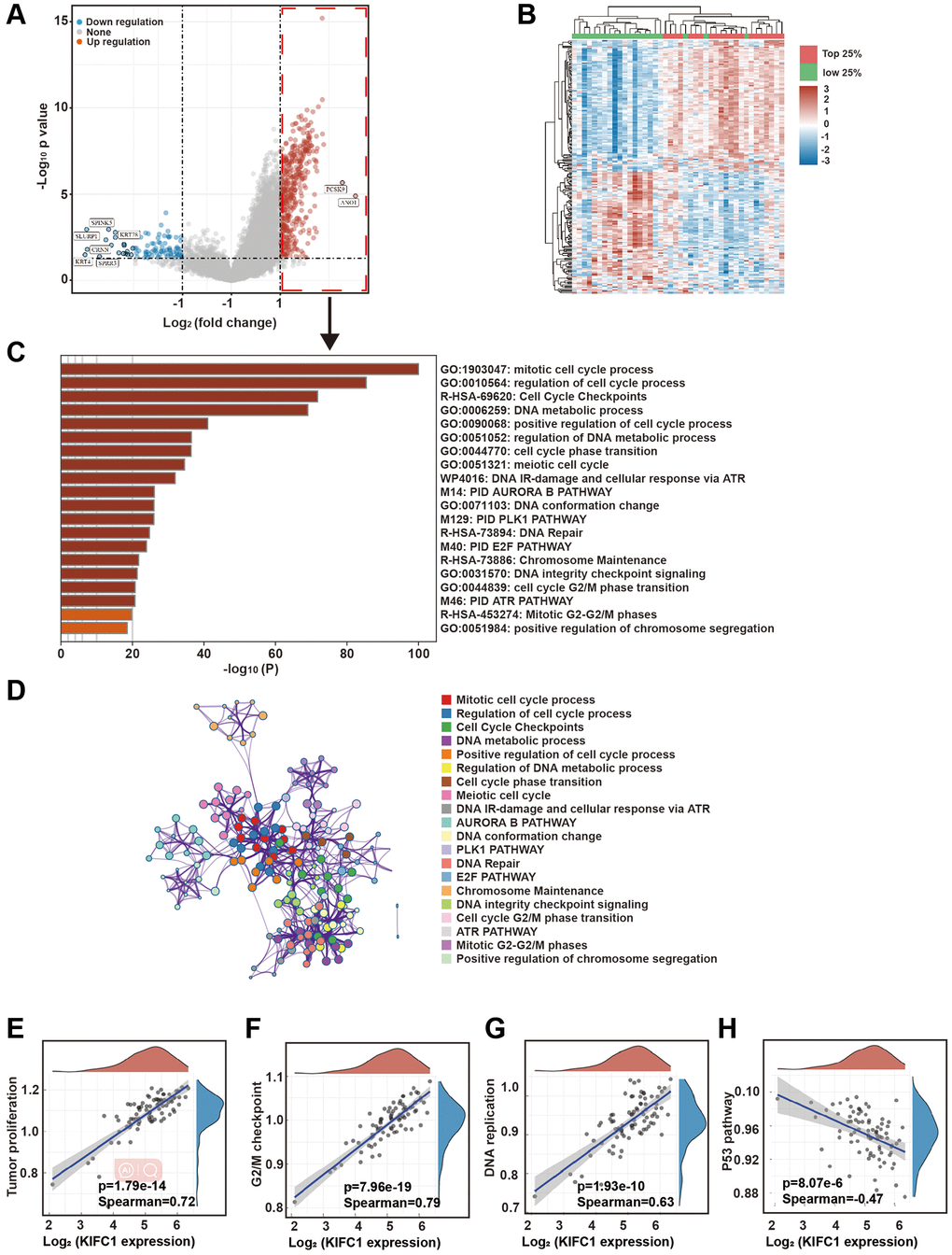 In order to investigate the mechanism through which KIFC1 promotes proliferation in esophageal carcinoma cells, we utilized the data from 82 ESCC cases in TCGA for analysis. The heat map of KIFC1 expression from the bioinformatics analysis was shown in Figure 2A. Further, we divided all samples into 4 groups according to the expression level of KIFC1. We analyzed the differential genes between the top 25% of samples and the bottom 25% of samples based on KIFC1 expression level. The volcano plot of these differential genes was shown in Figure 2B. The GO clustering analysis of differential genes indicates that, compared to samples with low KIFC1 expression, the genes that were elevated in the KIFC1 high expression group were clustered in numerous cell cycle-related pathways (Figure 2C). The network of pathways was shown in Figure 2D. Correlation analysis of these pathways indicates a highly significant positive correlation between KIFC1 expression and tumor proliferation pathways (Figure 2E, Spearman coefficient = 0.72), G2/M checkpoints (Figure 2F, Spearman coefficient = 0.79), and DNA replication pathway (Figure 2G, Spearman coefficient = 0.63). Additionally, there was a highly significant negative correlation with the P53 pathway (Figure 2H, Spearman coefficient = −0.47). The above analysis suggests that high expression of KIFC1 was a sign of vigorous cell division. Elevated expression of KIFC1 could potentially affect the cell’s mitotic process.