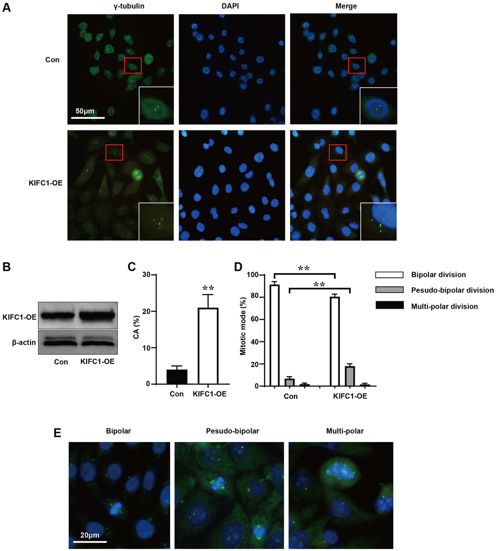 To further investigate the relationship between KIFC1 and cell division, we used an anti-gamma-tubulin antibody to label the centrosomes and spindle of control group cells and cells overexpressing KIFC1 (Figure 3A). When KIFC1 were overexpressed (Figure 3B), cells in the KIFC1 overexpression group showed more instances of centrosome amplification (Figure 3C). Further, we statistics the ways in which cells entered the metaphase and anaphase of cell cycle before and after overexpression of KIFC1. Although there were more instances of centrosome amplification in cells overexpressing KIFC1, the cells tended to complete mitosis through pseudo-bipolar division (Figure 3D), in which extra centrosomes tended to cluster at the two poles of the spindle (Figure 3E).