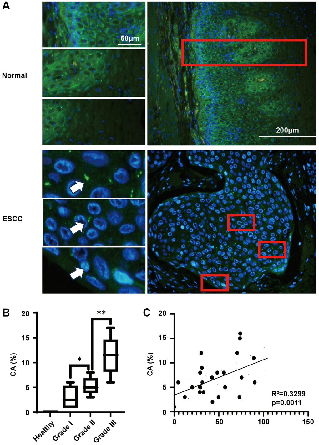 For immunofluorescence staining of tissues, briefly, we first dewaxed and rehydrated the paraffin sections of ESCC tissues. Then, antigen retrieval was performed using tris-EDTA (pH 7.5) solution under high-temperature and high-pressure conditions. After 1 hour of blocking, immunofluorescence staining was conducted using anti-gama-tubulin antibody diluted at a ratio of 1:200, and incubated at 4°C overnight. On the following day, the staining with secondary antibodies was carried out at a dilution ratio of 1:1000. Subsequent steps for mounting and observation were the same as those for cell staining.