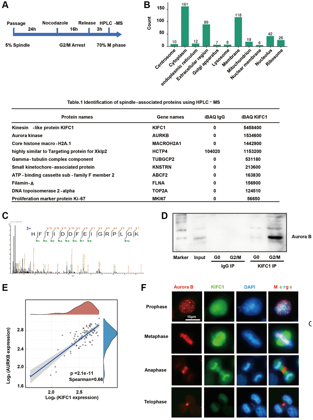 KIFC1 exhibits dual functions in microtubule organization and vesicle transport, which have not been thoroughly explored. To investigate the molecular mechanisms through which KIFC1 promote centrosome amplification and pseudo-bipolar division, we treated cells with nocodazole to enrich for G2/M phase cells. After release, an estimated 70% of the cells progressed to the metaphase. Co-immunoprecipitation (Co-IP) and high-performance liquid chromatography-mass spectrometry (HPLC-MS) were utilized to identify the proteins interacting either directly or indirectly with KIFC1 (Figure 5A). GO clustering allowed us to focus on proteins localizing to the spindle (Figure 5B). The spindle associate proteins were shown in Table 1. (In Supplementary Table 1, we present all the proteins that directly or indirectly interact with KIFC1, and their interaction network was shown in Supplementary Figure 2). Intriguingly, Aurora B was the most powerful protein amongst all contenders (Figure 5C). Co-IP and western blot experiments revealed a significant rise in the binding between KIFC1 and Aurora B during metaphase (Figure 5D). A bioinformatics analysis demonstrated a substantial positive correlation (Figure 5E, spearman = 0.66) between KIFC1 and Aurora B mRNA expression levels in ESCC. Furthermore, we confirmed the binding of KIFC1 and Aurora B through co-localization using immunofluorescence techniques (Figure 5F).