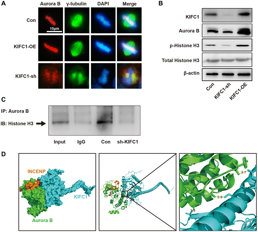 To investigate the regulatory mechanisms of KIFC1 on Aurora B, we manipulated KIFC1 expression through both knockdown and overexpression approaches and conducted subsequent studies via co-localization immunofluorescence and western blot. Upon overexpression of KIFC1 within cells, Aurora B displayed proper subcellular localization, and a significant augmentation in fluorescence intensity was observed. However, the ablation of KIFC1 resulted in a mis-localization of Aurora B outside chromosomes accompanied by significant absence in chromosomal location, resulting in abnormal chromosomal morphology (Figure 6A). Examination of protein levels through western blot revealed that KIFC1 knockdown mildly reduced Aurora B protein levels, while overexpression remarkably elevated its levels (Figure 6B). After knocking down KIFC1, the binding between Aurora B and its classical substrate, Histone H3, was significantly reduced (Figure 6C). Lastly, we inspected the protein expression levels and phosphorylation state of Histone H3, a classic Aurora B substrate, and found that the knockdown of KIFC1 significantly reduced the phosphorylation level of Histone H3, with KIFC1 overexpression substantially enhanced it. Finally, we performed molecular docking using the KIFC1 structure from Alpha Fold and the Aurora B- INCENP complex structure listed in the PDB. The docking results indicate that the spatial distances between Aurora B-Tyr860 and KIFC1-Asn617, Aurora b-Ser338 and KIFC1-Ser597, and Aurora b-Ala319 and KIFC1-Thr368 are 3.7, 3.9, and 1.8 angstroms, respectively. There are significant intermolecular hydrophobic interactions present (Figure 6D). These results demonstrate that KIFC1 carries a dual function in regulating the protein levels and subcellular localization of Aurora B, offering a new perspective for understanding the molecular mechanisms by which KIFC1 promotes ESCC cell proliferation and centrosome aberration.