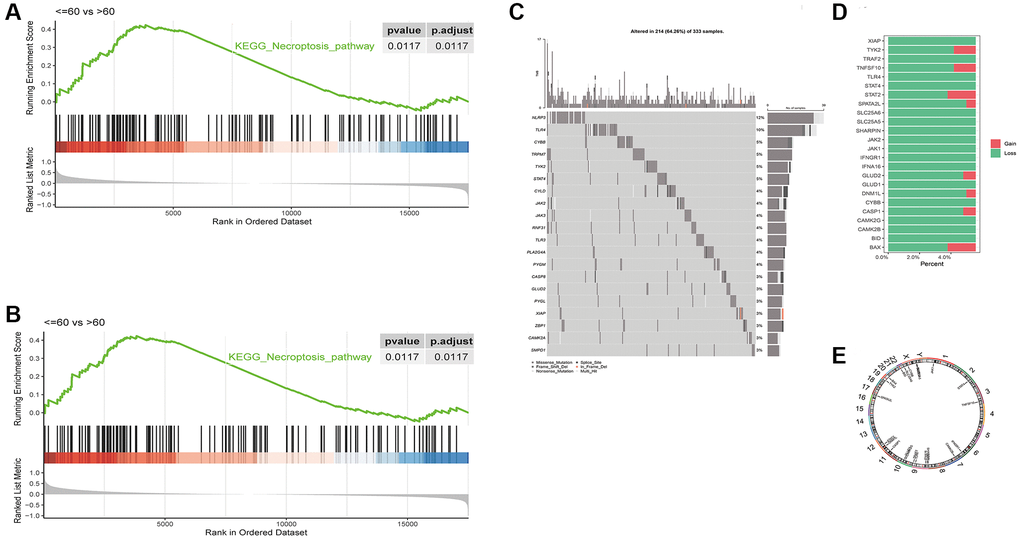 In our study, we found that the necroptosis pathways were significantly different between the younger (≤60 years) or older (>60 years) subgroups of LUSC, whereas the tumor stage did not show any significant correlation. A previous study reported that old age portended worse prognosis in NSCLC patients [28]. Consistent with our findings, another bioinformatics study on LUSC also did not observe any difference in necroptosis-related pathways between different tumor stages [15, 29]. We analyzed the CNV data of 24 necroptosis genes, of which most showed loss of function. In addition, most necroptosis genes were differentially expressed between the normal lung samples and LUSC samples.
