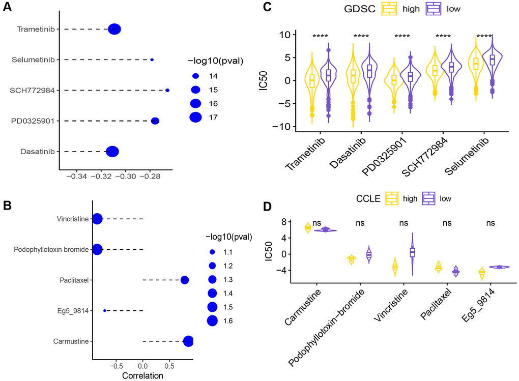The pharmacological data from the Genomics of Drug Sensitivity in Cancer (GDSC) and Cancer Cell Line Encyclopedia (CCLE) are routinely used to identify potential targets of candidate anti-cancer drugs [37], although there are concerns regarding the lack of reproducibility in drug sensitivity measurements across studies [38]. We identified five candidate drugs, including trametinib, selumetinib, SCH772984, PD 325901 and dasatinib, that likely target the necroptosis genes in our model. Furthermore, there were significant differences in the sensitivity of the high-risk and low-risk patients to these drugs, which was also validated through in vitro experiments on the A549 cell line.