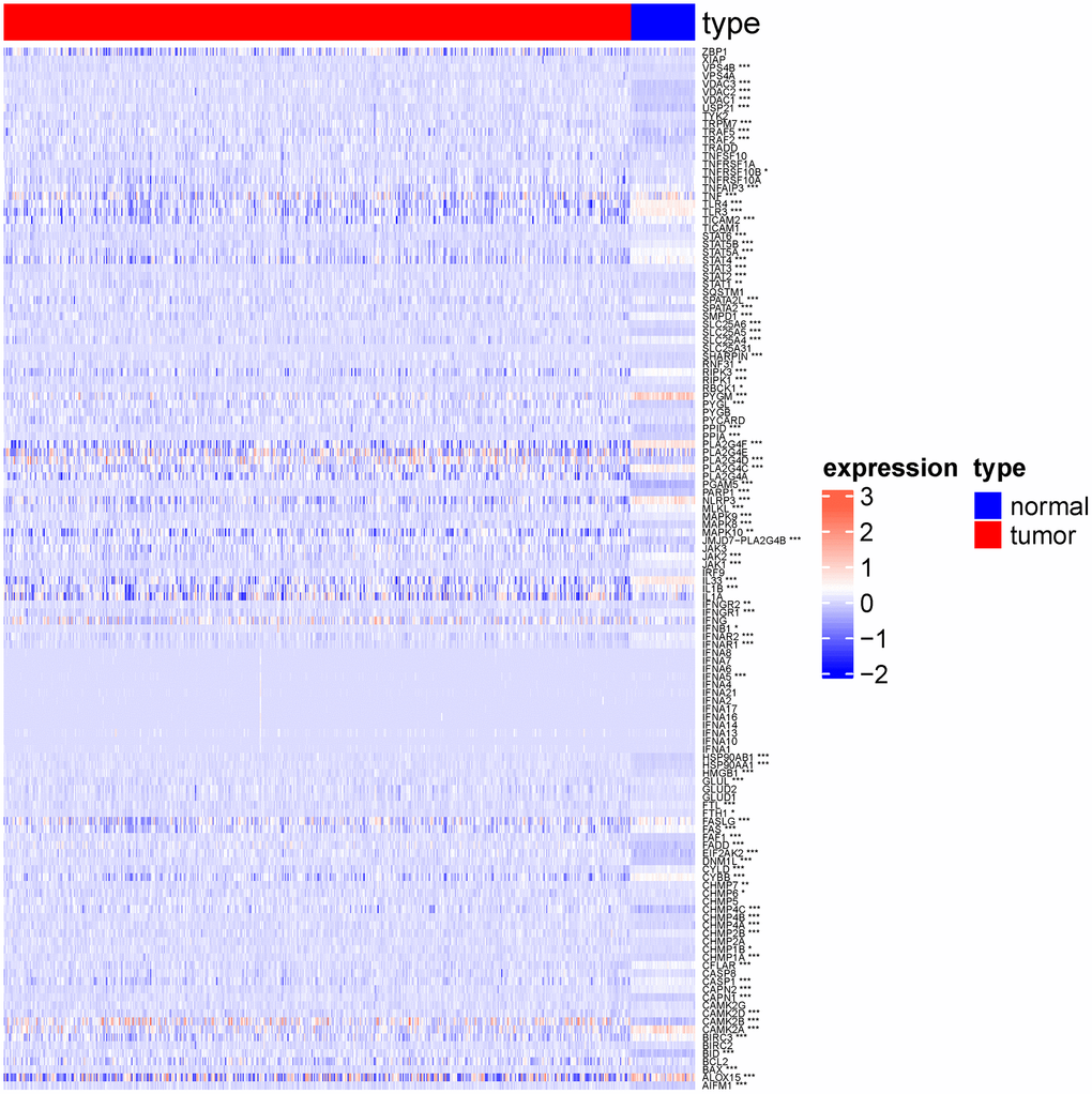 All statistical analyses were performed using R 4.1.1 (http://www.Rproject.org), GraphPad Prism 7 software, and ImageJ software. A statistically significant threshold was considered when p < 0.05. The t-test was employed to evaluate normally distributed data, while the Mann-Whitney U test was utilized for assessing non-normally distributed data. The overall survival was analyzed by the Kaplan-Meier method in different groups, and univariate and multivariate Cox regression analyses were performed to evaluate the correlation between the necroptosis signature and clinical characteristics in the training and validation sets.