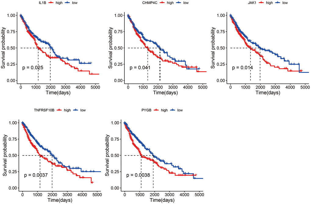 Five necroptosis genes, including CHMP4C, IL1B, JAK1, PYGB and TNFRSF10B, were significantly correlated to the survival. Liu et al. showed that CHMP4C is overexpressed in LUSC patients and portends poor prognosis, and its knockdown induced S-phase arrest in LUSC cells in vitro [30]. Furthermore, polymorphisms in the IL1B promoter have been linked to the risk of lung cancer development [31]. Low expression of JAK1 is closely associated with immune infiltration and poor prognosis in lung adenocarcinoma [32]. Likewise, low-level amplification of PYGB epigenetically regulate smoking-induced lung carcinogenesis [33]. High levels of TNFRSF10B mRNA and its encoded protein TRAIL-2 in EGFR wild-type NSCLC are predictive of unfavorable prognosis [34]. Furthermore, the YIPF2-TNFRSF10B axis is closely linked to the malignant progression of NSCLC [35].