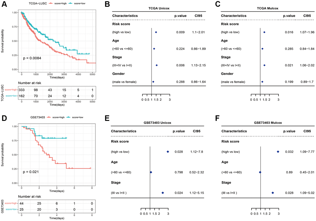 We also verified the signature in the external dataset GSE73403 using the optimal grouping threshold of 1.213578. As shown in Figure 6D, the high-risk group had worse survival compared to the low-risk group (p = 0.021). In addition, the necroptosis signature was validated as an independent prognostic factor by univariate (p = 0.028) and multivariate (p = 0.032) Cox analyses (Figure 6E, 6F) as in the training set. As shown in Figure 7A, 7B, the distribution of tumor stages and gender were significantly different between the two risk groups in the TCGA_LUSC dataset (p < 0.05), whereas age was correlated with the risk score in the GSE73403 dataset (p = 0.0163).