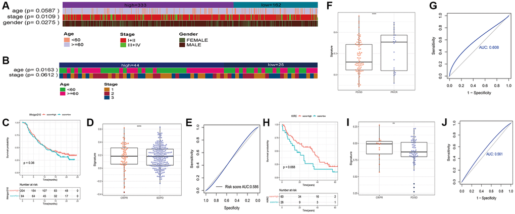 To further explore the correlation between the necroptosis signature and the response to immunotherapy, we evaluated the prognosis of patients in independent cancer cohorts including immunotherapy data. As shown in Figure 7C–7E), the necroptosis signature was not significantly correlated with the survival of bladder cancer patients in the IMvigor210 dataset (Figure 7C), but there was a significant difference in the response of the high-risk and low-risk patients after immunotherapy (p < 0.0001, Figure 7D). The prediction rate for patient response was 58.6% (Figure 7E). In the GSE91061 dataset of melanoma patients, the necroptosis signature was associated with the response to immunotherapy (p < 0.0001, Figure 7F), and the prediction rate was 60.8% (Figure 7G). Unfortunately, the survival data was not available for these patients. Furthermore, there was no difference in the survival prognosis of the low-risk and high-risk clear cell renal cell carcinoma patients (Figure 7H), while the response to immunotherapy showed significant differences (p < 0.0001, Figure 7I). The prediction rate of patient response was 56.1% (Figure 7J).