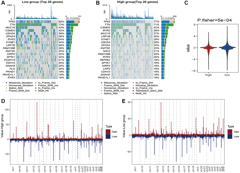 The mutation and copy number variation (CNV) data of LUSC were downloaded from the TCGA database. The “matfoos” package was used to display the overall mutation and CNV status of necroptosis genes, and the “Rcircos” package was used to draw their chromosomal distribution map. Based on TCGA RNA-seq data, the differentially expressed necroptosis genes between LUSC and normal lung samples were screened using the “limma” package, and the differences in the expression levels of the necroptosis genes between different clinical subgroups (immunotype, stage, smoking history, ALK-eml4 rearrangement, age, gender, etc.) were analyzed by Wilcox test. The patients in TCGA_LUSC cohort were divided into the respective low- and high-expression groups based on the median expression level of each necroptosis gene, and the differences in overall survival (OS) were analyzed by the Kaplan-Meier method using the “survival” package. The methylation data of LUSC were downloaded from the TCGA database, and the differential methylation levels of necroptosis genes between LUSC and normal lung samples were calculated using the “ChAMP” package.