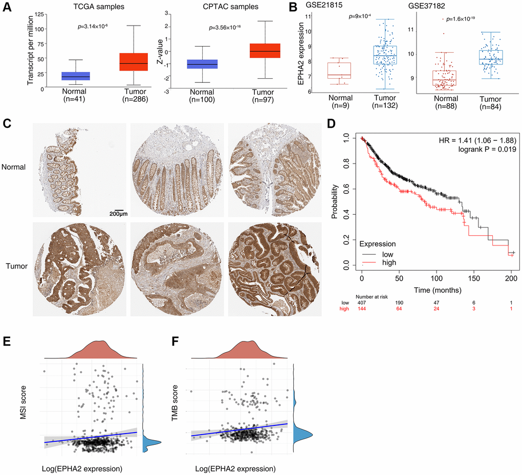 To verify the correlation between EphA2 and colorectal cancer, we found that the mRNA expression level of EphA2 was significantly higher in colorectal samples than in normal tissues using TCGA samples from the UALCAN database (https://ualcan.path.uab.edu/index.html), and similarly, we analyzed the protein expression level of EphA2 using CPTAC samples and also found that its expression was significantly higher in colorectal cancer tissues than in normal samples (Figure 1A). We further analyzed two datasets in the GEO database (GSE21815 and GSE37182) and found that EphA2 expression was significantly upregulated in tumors (Figure 1B). Then, we assessed the protein expression levels of EphA2 in normal and colorectal cancer tissues by tissue samples from the Human Protein Atlas database. The immunohistochemical (IHC) staining data as shown in Figure 1C revealed that the protein expression level of EphA2 was significantly elevated in tumor tissues. Using the Kaplan Meier plotter database (http://kmplot.com/analysis/), we analysed the relevance of EphA2 expression to the prognosis of colorectal cancer patients and found that among 551 colorectal cancer patients, those with high EphA2 expression had a worse prognosis (Figure 1D). MSI and TMB have been used as predictive biomarkers for immunotherapy in a variety of tumours [30–32]. We analysed the correlation between EphA2 expression and MSI and TMB using TCGA colorectal cancer data and found a significant positive correlation between EphA2 expression and MSI and TMB scores (Figure 1E, 1F).