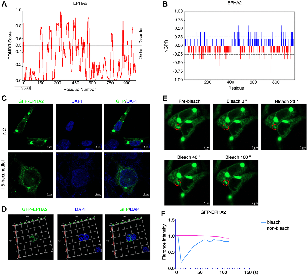 In recent years, phase separation of biological macromolecules has gained much attention. Phase separation, also known as biomolecular condensates, is involved in regulating a variety of physiological processes, including gene expression, DNA damage repair, signal transduction, cellular metabolism, and immune regulation, by forming membraneless organelles [15–20]. Multivalent interactions are key in driving phase separation [21, 22]. Dysregulation of phase separation can lead to the formation of abnormal condensates, which can cause a variety of human diseases, such as cancer and neurodegenerative diseases [23, 24]. More and more studies are now also focusing on cell membrane molecules that can also transmit cellular signals through the occurrence of phase separation, including T cell receptors, androgen receptors, receptor tyrosine kinases, etc., [25–27]. Whether EphA2, an important receptor tyrosine kinase, can promote tumor development through the occurrence of phase separation has not been reported.