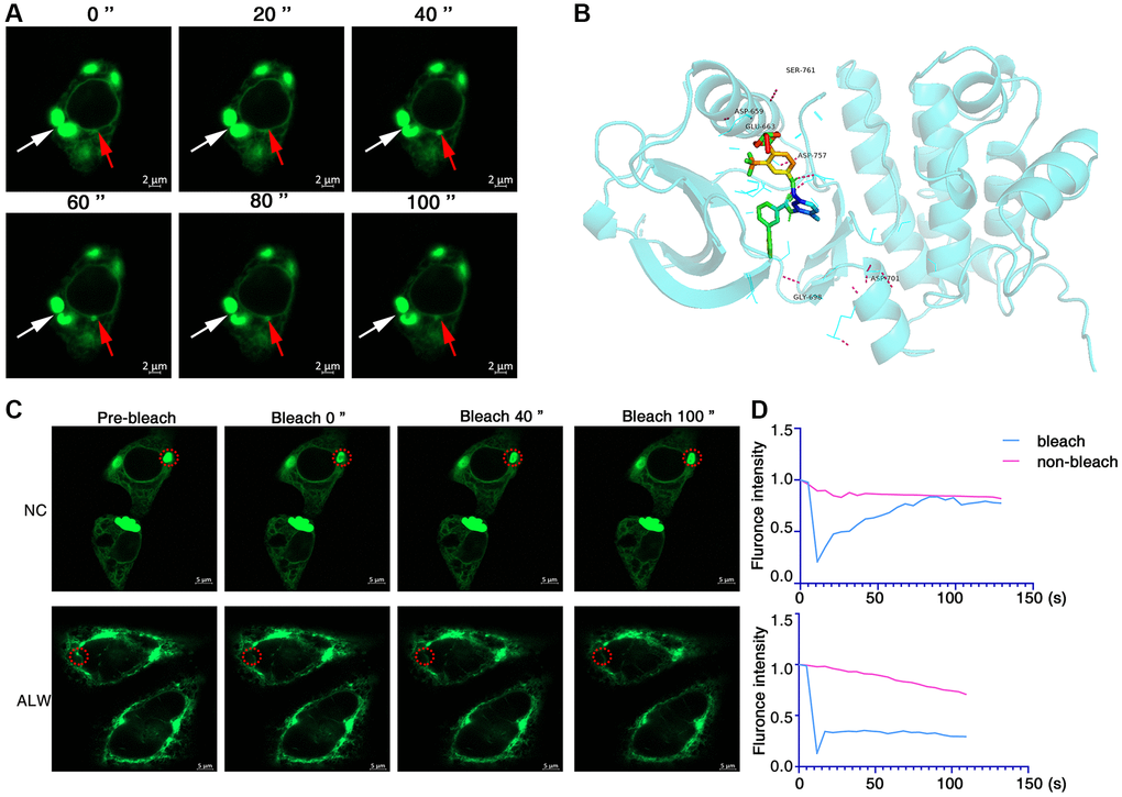 The ATP-competitive tyrosine kinase inhibitor ALW-II-41-27 (ALW) of EphA2 has been shown to inhibit the growth of a variety of tumour cells in vitro and in vivo [9, 41]. To investigate the effect of ALW on EphA2 phase separation, we first used molecular docking techniques to demonstrate that ALW can bind to multiple pockets of EphA2 protein (Figure 3B). We also further found, using FRAP experiments, that the dynamic properties of the bleached GFP-EphA2 phase separation condensate were significantly weaker after treating the cells with ALW (Figure 3C, 3D). These results suggest that inhibitors of EphA2 can disrupt its phase separation properties.