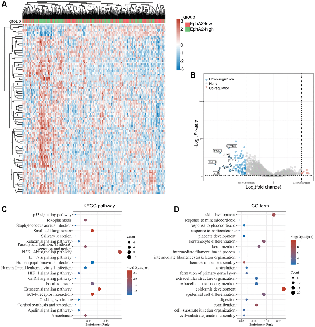 Ferroptosis is a form of programmed cell death different from apoptosis and necrosis, characterized by the accumulation of peroxidized lipids in the cell membrane and intracellular reactive oxygen species clusters up to lethal levels, mainly involving biological processes such as glutathione metabolism, iron metabolism, lipid metabolism and oxidative stress. In recent years, numerous studies have identified the role of ferroptosis in anti-tumour, and targeting ferroptosis-related mechanism pathways can effectively inhibit tumourigenesis and development [42–44]. To explore the relationship between EphA2 and ferroptosis, we first analysed differential gene expression in samples with differential EphA2 expression using TCGA colorectal cancer samples, and in total we identified seven up-regulated and 92 down-regulated genes (Figure 4A, 4B). We further performed KEGG and GO analysis on the differential genes regulated by EphA2 and found that these gene-enriched pathways are closely related to tumor development, such as p53, HIF-1, PI3K and other signaling pathways (Figure 4C, 4D). Furthermore, we analyzed the correlation between EphA2 expression and the expression of common ferroptosis-related genes in colorectal cancer and found that EphA2 expression was significantly correlated with the expression of several ferroptosis-related genes (Figure 5A, 5B). These results suggest that EphA2 may influence the development of colorectal cancer through the regulation of ferroptosis.