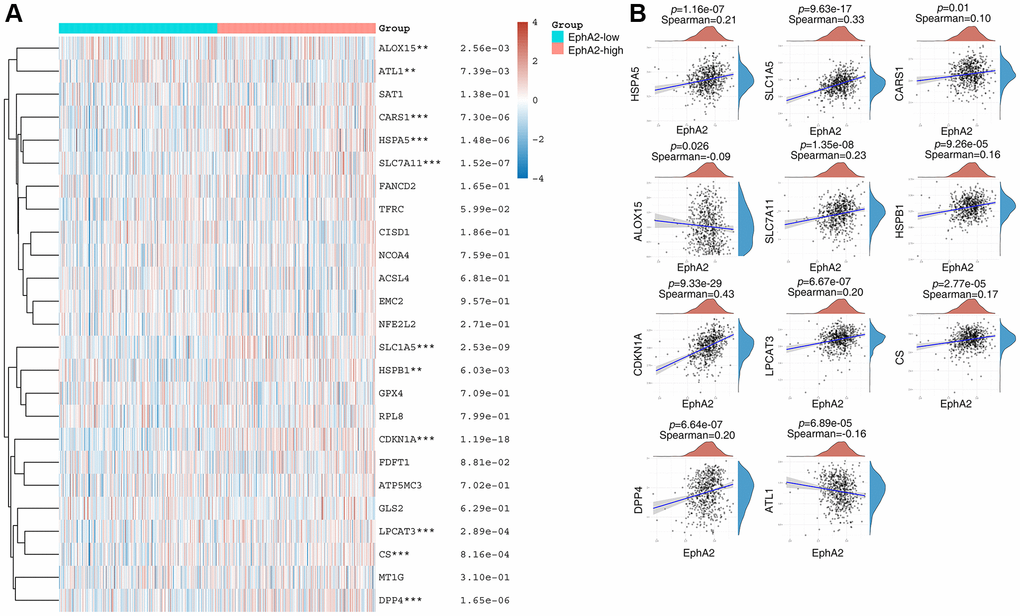Ferroptosis is a novel mode of cell death that has been shown to be involved in the development of many cancers and to increase the susceptibility of cancers to radiotherapy, providing a new theoretical basis for the prevention and treatment of cancer. For example, in hepatocellular carcinoma donafenib and GSK-J4 synergistically induce ferroptosis in tumor cells through upregulation of HMOX1 expression [57]. ASCL1 can promote progression of castration-resistant prostate cancer to neurosecretory prostate cancer by mediating ferroptosis resistance [58]. In gastric cancer cells, the HNF4A-BAP31-VDAC1 axis synchronously regulates tumor cell proliferation and ferroptosis [59]. The occurrence of ferroptosis is regulated by several genes, such as GPX4, CDKN1A, SLC1A5, and ACSL4, etc. In this study, we found that EphA2 expression showed significant correlation with several ferroptosis-related genes, including ALOX15, ATL1, CARS1, HSPA5, SLC7A11 and SLC1A5, etc., [42], suggesting that EphA2 may influence tumour progression by regulating iron death in colorectal cancer.
