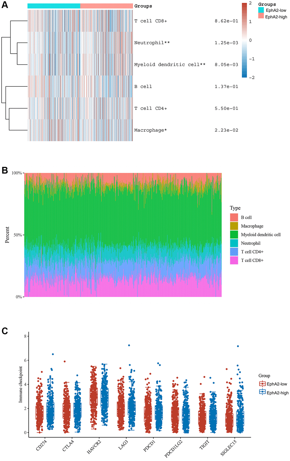 In recent years, the emergence of tumor immunotherapy has changed the traditional pattern of tumor treatment. It is one of the most promising research directions in the field of tumour therapy, and has been widely used as the fourth tumour treatment in clinical practice [60]. Tumour immunotherapy is mainly divided into immune checkpoint blockades (ICBs) and chimeric antigen receptor T cell immunotherapy. In this study, we found that EphA2 expression correlated with infiltration of a variety of immune cells, such as neutrophils, myeloid dendritic cells and macrophage cells, but EphA2 expression did not correlate significantly with common immune checkpoints such as PDCD1, CTLA4, and CD274, etc., These results suggest that EphA2 may regulate the development of colorectal cancer by influencing the infiltration of immune cells.