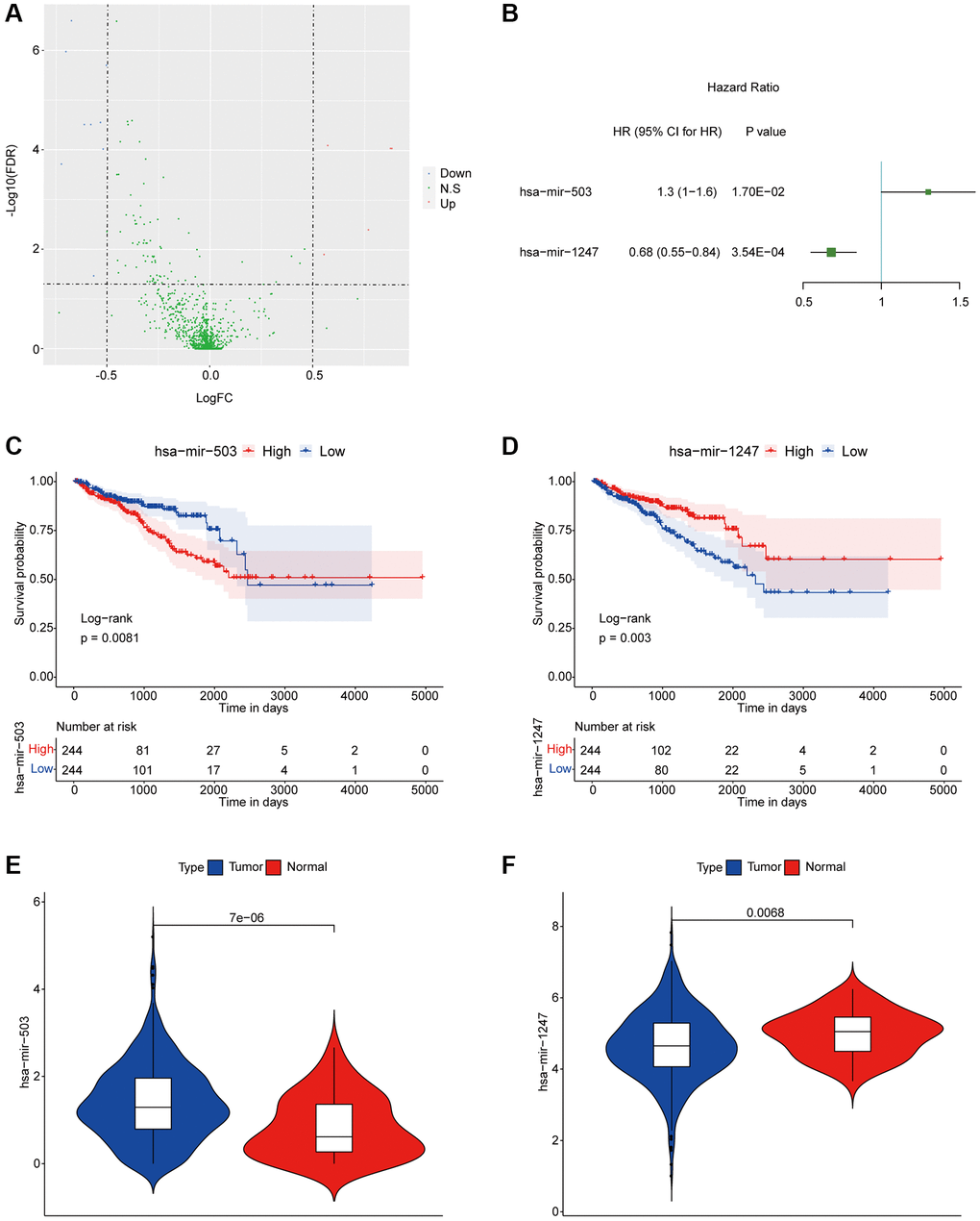 We previously divided PC patients into three groups with significant differences in disease free survival (DFS) according to proportions of tumor-infiltrating immune cell subpopulations, in which PC samples in cluster 1 had better DFS while PC samples in cluster 3 had worse DFS [14]. In present study, we further screened miRNAs associated with DFS of PC patients. Firstly, we analyzed all differentially expressed miRNAs (DEMs) of PC samples from the poor DFS group (cluster 3) and the better DFS group (cluster 1), and the detailed sample list of cluster 1/cluster 3 was included in Supplementary Table 1. As the results, there were 14 DEMs between two groups, including 9 down-regulated and 5 up-regulated miRNAs (Figure 1A). Among them, the hsa-mir-503 and hsa-mir-1247 were significantly correlated with DFS by univariate Cox regression analysis (Figure 1B). Then, basing on the median expression values of hsa-mir-503 (median expression level, 1.284408119) and hsa-mir-1247 (median expression level, 4.639203101), all PC patients were divided in high and low expression groups, respectively. And hsa-mir-503 was a risk factor and the higher the expression, the worse the prognosis (HR (hazard ratio) = 1.3, 95% CI (confidence interval): 1–1.6, p = 0.017); while hsa-mir-1247 was a protective factor, the higher the expression, the better the prognosis (HR = 0.68, 95% CI: 0.55–0.84, p = 0.000354) (Figure 1C, 1D). As a member of miR-15/16 family, miR-503 was down-regulated in several tumors, such as oral cancer and gastric cancer, while it was overexpressed in retinoblastoma and adrenocortical carcinoma, indicating that the expression pattern of miR-503 was tissue or disease-specific [15]. In this study, we found that the expression level of hsa-mir-503 in PC samples was significantly higher than that in para-cancer samples (Figure 1E, p = 7E-06), the expression of hsa-mir-1247 was down-regulated in the tumor sample (Figure 1F, p = 0.0068).