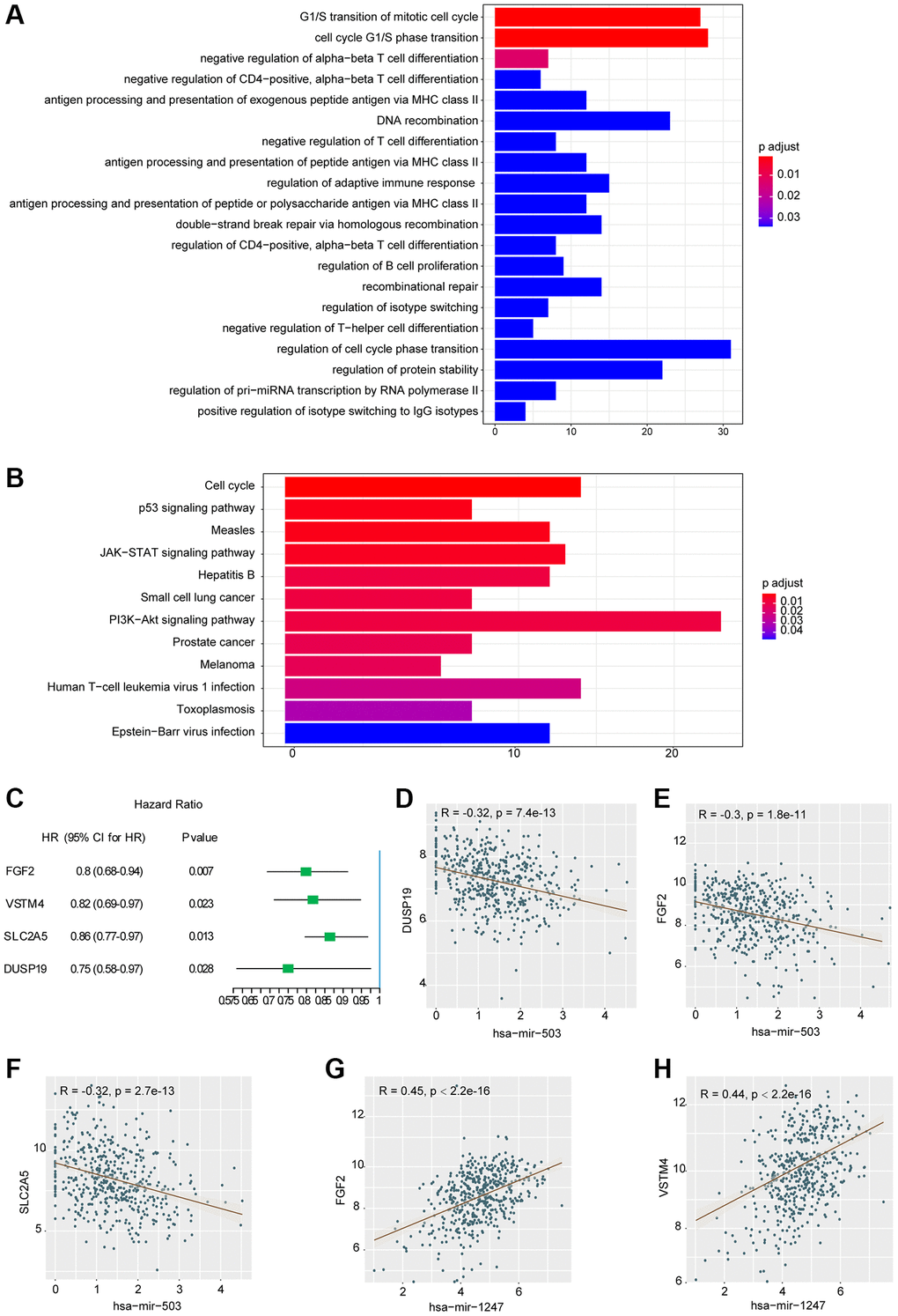 To further investigate the relationship between hsa-mir-503/hsa-mir-1247 and 649 target mRNAs, WGCNA package in R programming software was used for correlation analysis. A total of 868 miRNA-mRNA correlation relationships were screened, including 339 pairs of negative correlation (NeC) and 529 pairs of positive correlation (PoC) (p < 0.05, the results were listed in Supplementary Table 3). We selected the top 10 mRNA from the PoC and NeC pairs and further evaluated their prognostic value by univariate Cox regression analysis. The hazard ratio value showed that 4 mRNAs were significantly correlated with DFS (p < 0.05, Figure 2C), including FGF2 (fibroblast growth factor 2), VSTM4 (V-set and transmembrane domain containing 4), SLC2A5 (solute carrier family 2 member 5), and DUSP19 (dual specificity phosphatase 19). And the higher the expression level, the better the prognosis. Among the 4 mRNAs, DUSP19, FGF2, and SLC2A5 were negatively correlated with hsa-mir-503 (Figure 2D–2F), while FGF2 and VSTM4 were positively correlated with hsa-mir-1247 (Figure 2G, 2H).