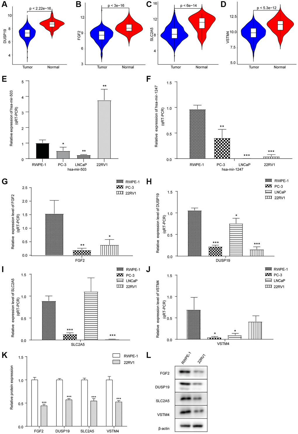 The hsa-mir-503 was highly expressed in 22RV1 cells, which triggered us to explore the effect of hsa-mir-503 and hsa-mir-1247 expression on PC progression. We further performed WB on RWPE-1 and 22RV1, and the results showed that compared with RWPE-1 cells, the expression levels of FGF2, DUSP19, SLC2A5 and VSTM4 in 22RV1 cells were significantly decreased (Figure 3K, 3L), which suggested that 22RV1 was a suitable PC cell type for this study.