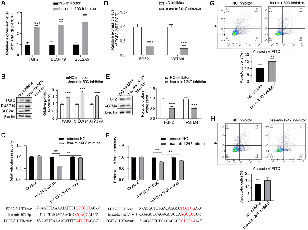 Apoptosis rates of the 22RV1 cells were estimated by flow cytometry after the interference to hsa-mir-503 and hsa-mir-1247, respectively. After transfection of has-mir-503 inhibitor and NC inhibitor in 22RV1 cells for 24 h, cells were collected for apoptosis detection according to the operation procedure. The results showed that has-mir-503 inhibitor group promoted cell apoptosis compared with NC inhibitor group (Figure 4G). However, knockdown of hsa-mir-1247 expression had no significant effect on the apoptosis rate of 22RV1 cells (Figure 4H).