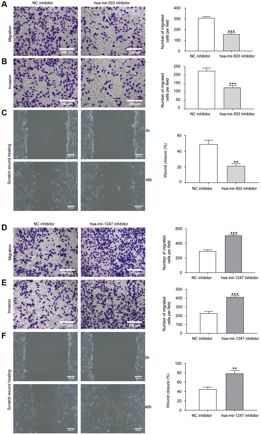 Migration and invasion were necessary characteristics for malignant progression [19]. Transwell chamber was used for cell migration and invasion analysis. As shown in Figure 5A, 5B, compared with NC inhibitor group, knockdown of hsa-mir-503 expression in 22RV1 resulted in a significant reduction of cells migrating to the bottom surface of the Transwell chamber. The scratch wound healing experiment further demonstrated that knockdown of hsa-mir-503 reduced the migration and invasion ability of 22RV1 cells (Figure 5C). Interestingly, knockdown of hsa-mir-1247 enhanced the migration and invasion of 22RV1 cells (Figure 5D–5F). This evidence suggested that hsa-mir-503 and hsa-mir-1247 might have opposite effects in the progression of PC, and hsa-mir-503 has the potential to promote tumor metastasis, whereas hsa-mir-1247 exhibited great potential as an anti-tumor factor in PC.