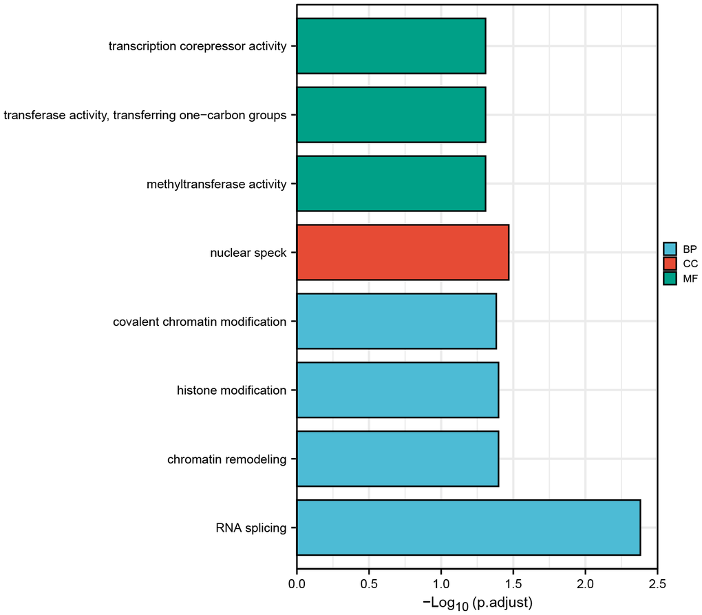 ZNF692 was found to activate the PI3K/AKT pathway, thereby promoting growth and metastasis in COAD [8]. Upregulation of ZNF692 enhances G1/S conversion by regulating the p27 kip1/P Thr160-CDK2 signaling pathway in CC cells [10]. In this study, we found that ZNF692 is involved in the biology processes (RNA splicing, chromatin remodeling, histone modification, and covalent chromatin modification), cellular components (nuclear speck) and molecular functions (methyltransferase activity, transferase activity, transferring one-carbon groups, and transcription corepressor activity). The detailed mechanism of ZNF692-mediated molecular function needs to be further investigated.
