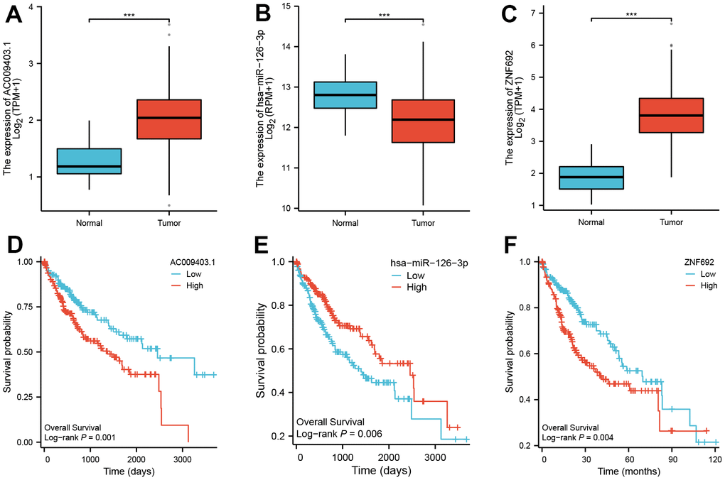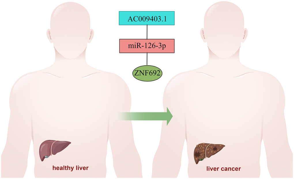 The expression of ZNF692 exhibited a significant upregulation in HCC. However, the regulatory network associated with ZNF692 remained unidentified. Through analysis of the TCGA database, we discovered a significant upregulation of AC009403.1 expression in HCC (as depicted in Figure 12A), which was also indicative of a poor prognosis (p = 0.001, Figure 12D). The expression of miR-126-3p was found to be significantly downregulated in HCC (Figure 12B), and its low expression was associated with a poor prognosis (p = 0.006, Figure 12E). The upregulation of ZNF692 in HCC was found to be statistically significant (Figure 12C), and its high expression was indicative of a negative prognosis (p = 0.004, Figure 12F). To illustrate this, we employed Figdraw to construct a ceRNA network involving AC009403.1/miR-126-3p/ZNF692 in HCC (Figure 13).