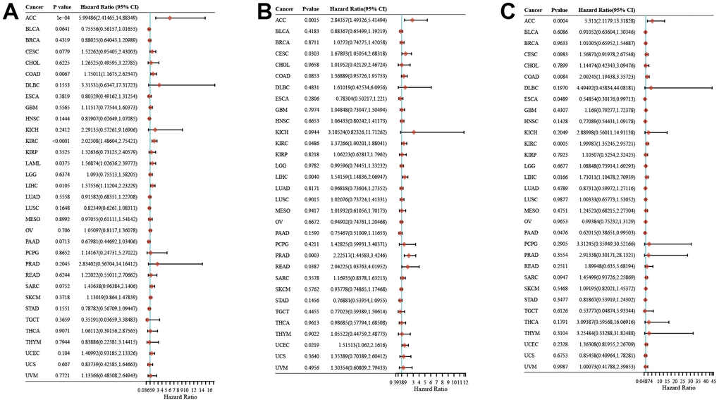 Univariate Cox regression analysis was conducted using the ‘forestplot’ R package to display the P-value, hazard ratio (HR), and 95% confidence interval (CI) for each variable. RNA sequencing expression (level 3) profiles and corresponding clinical information for 33 tumors were obtained from the TCGA [16–18]. The ‘forestplot’ R package was employed to generate forest plots for the univariate Cox regression analysis.