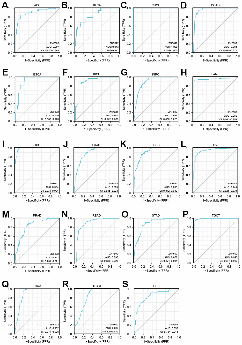 ROC curves were utilized to assess the diagnostic efficacy of ZNF692 in 33 tumors. The analysis of the ROC curves revealed the presence of the ZNF692 gene in various tumor types, including ACC (AUC = 0.897), BLCA (AUC = 0.843), CHOL (AUC = 1.000), COAD (AUC = 0.961), ESCA (AUC = 0.919), KICH (AUC = 0.904), KIRC (AUC = 0.897), LAML (AUC = 0.958), LIHC (AUC = 0.984), LUAD (AUC = 0.889), LUSC (AUC = 0.905), OV (AUC = 0.945), PRAD (AUC = 0.841), READ (AUC = 0.893), STAD (AUC = 0.878), TGCT (AUC = 0.993), THCA (AUC = 0.902), THYM (AUC = 0.838), and UCS (AUC = 0.850) (Figure 3).