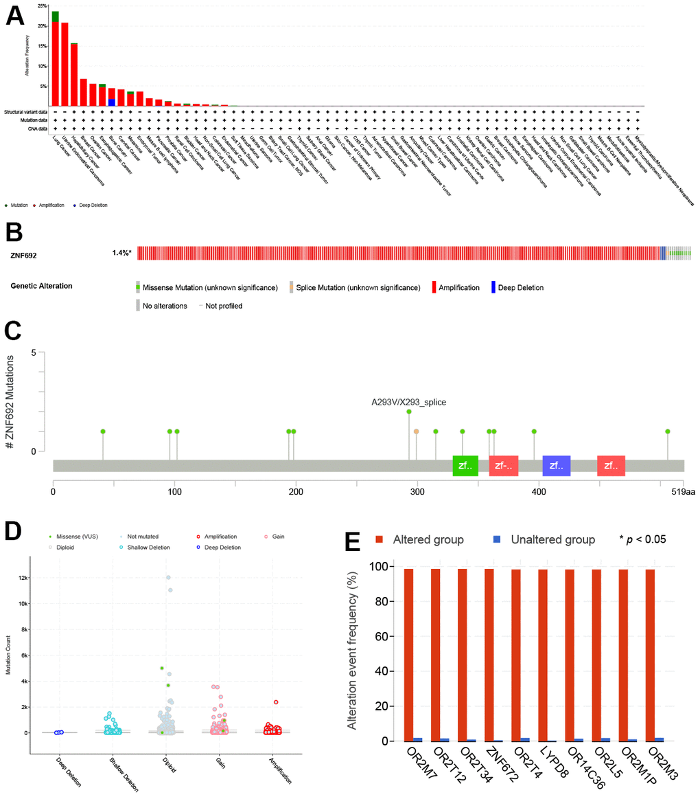 No genetic alterations of ZNF692 have been reported in pan cancer. Through the utilization of the cBioPortal database, we have determined that amplification is the prevailing alteration of ZNF692 in pan cancer. Furthermore, we have identified co-alterations of OR2M7, OR2T12, OR2T34, ZNF672, OR2T4, LYPD8, OR14C36, OR2L5, OR2M1P, and OR2M3 within the ZNF692 alteration group.