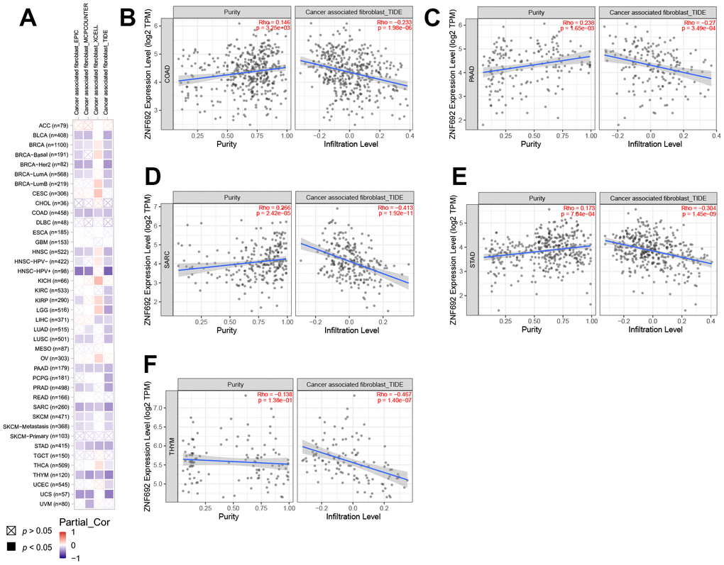 The correlation between ZNF692 expression and cancer-associated fibroblast (CAF) infiltration was investigated in a pan-cancer context using the “immune” module of TIMER2, accessible at http://timer.cistrome.org/ [23].