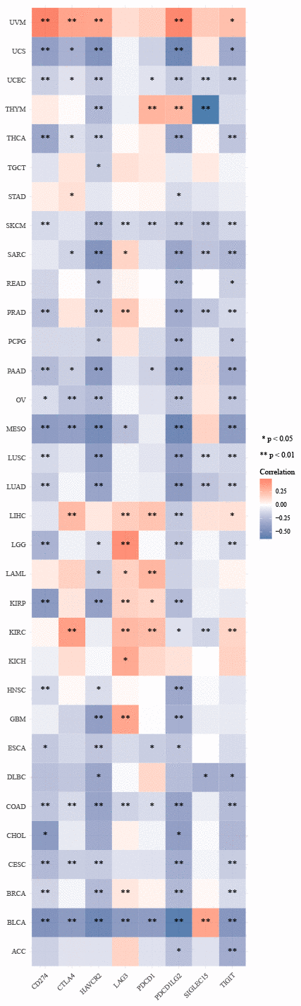 RNAseq data (level3) and corresponding clinical information for 33 tumors were obtained from the TCGA database. The expression levels of eight immune checkpoint genes (SIGLEC15, IDO1, CD274, HAVCR2, PDCD1, CTLA4, LAG3, and PDCD1LG2) were examined [24].
