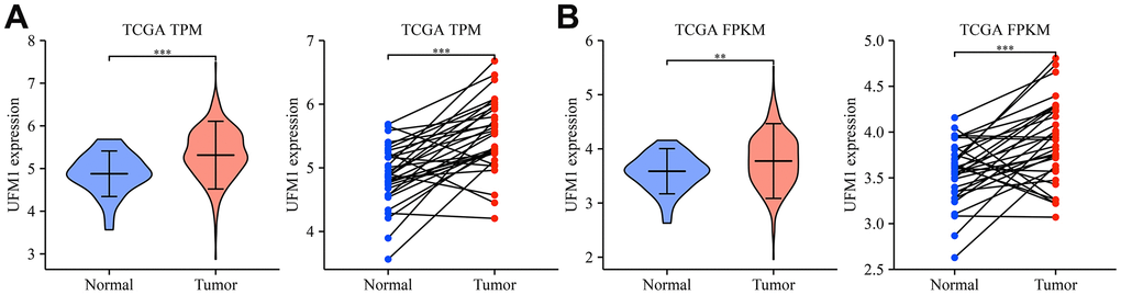 In August 2022, the UFM1 gene expression data of 32 normal tissues and 329 primary OSCC tissues were downloaded from the Cancer Genome Atlas (TCGA (https://www.cancer.gov/TCGA)) database, covering both data types: the reads per kilobase of transcript per million reads mapped (FPKM) and transcripts per million (TPM). The UFM1 gene expression data in normal and OSCC tissues were extracted using Perl language. Subsequently, the expression levels of UFM1 in normal and OSCC tissues were identified. In addition, the data from normal tissues and cancer tissues were matched and sorted. It was found that 32 patients had the normal tissues and matched cancer tissues. The expression levels of UFM1 in normal and cancer tissues from 32 paired cancer patients were identified.