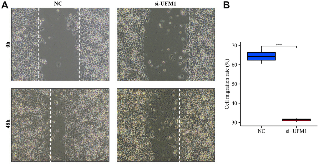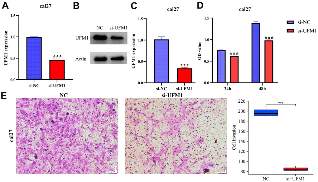 The mRNA and protein expression levels of UFM1 in the si-UFM1 group were significantly decreased using RT-PCR and Western blotting (Figure 9A–9C). CCK-8 detection exposed that inhibition of UFM1 expression significantly inhibited the cal27 cell proliferation, with statistically significant results (Figure 9D). The migration and invasion ability of cal27 cells were significantly decreased when UFM1 expression was inhibited (Figures 9E, 10).