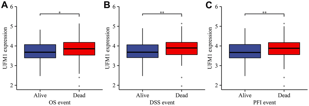 The expression levels of UFM1 in the tissues of deceased and surviving patients were identified under OS, DSS, and disease progression in OSCC patients. UFM1 expression was used for the classification. Moreover, the chi-square test was conducted to identify the relationship between the UFM1 expression and T stage, N stage, M stage, clinical stage, radiotherapy treatment, age, gender, tissue grade, smoking history, and OS, DSS, and PFI endpoint events in OSCC patients.