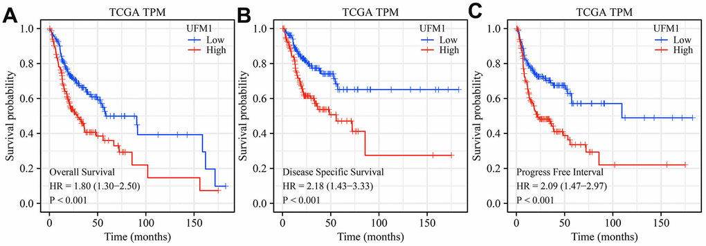 The UFM1 gene expression data were matched to the data of overall survival (OS), disease-specific survival (DSS) and progression-free interval (PFI) of cancer patients into groups. Dichotomous grouping was performed via the UFM1 expression level, and survival analysis was used to investigate the relationship between UFM1 expression and the OS, DSS, and cancer progression in OSCC patients.