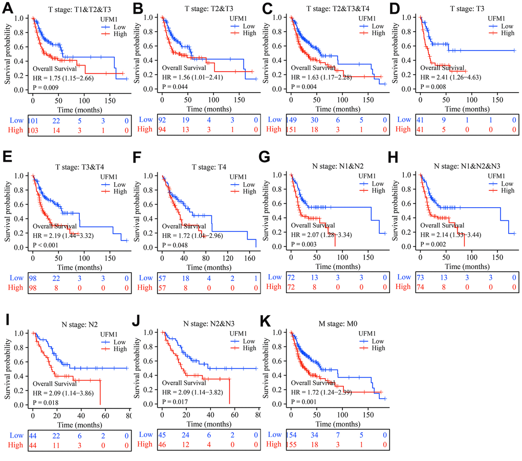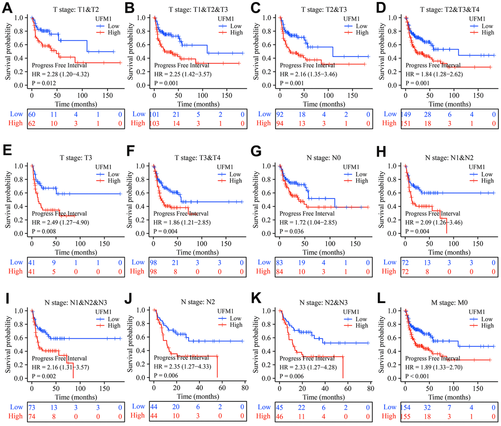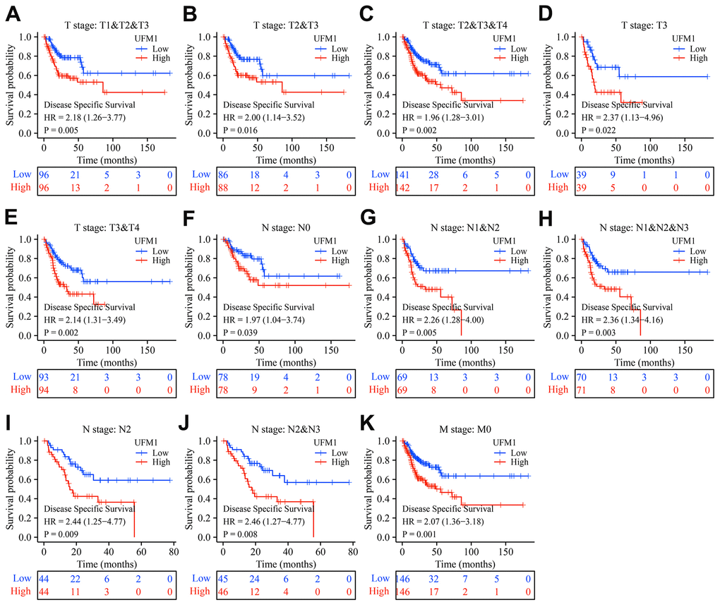 In the OS, DSS, and disease progression of OSCC patients, cancer patients were divided into subgroups according to the T stage, lymph node metastasis (N stage) and distant metastasis (M stage). The affiliation between UFM1 expression and OS, DSS, and disease progression in OSCC patients was identified through survival analysis.