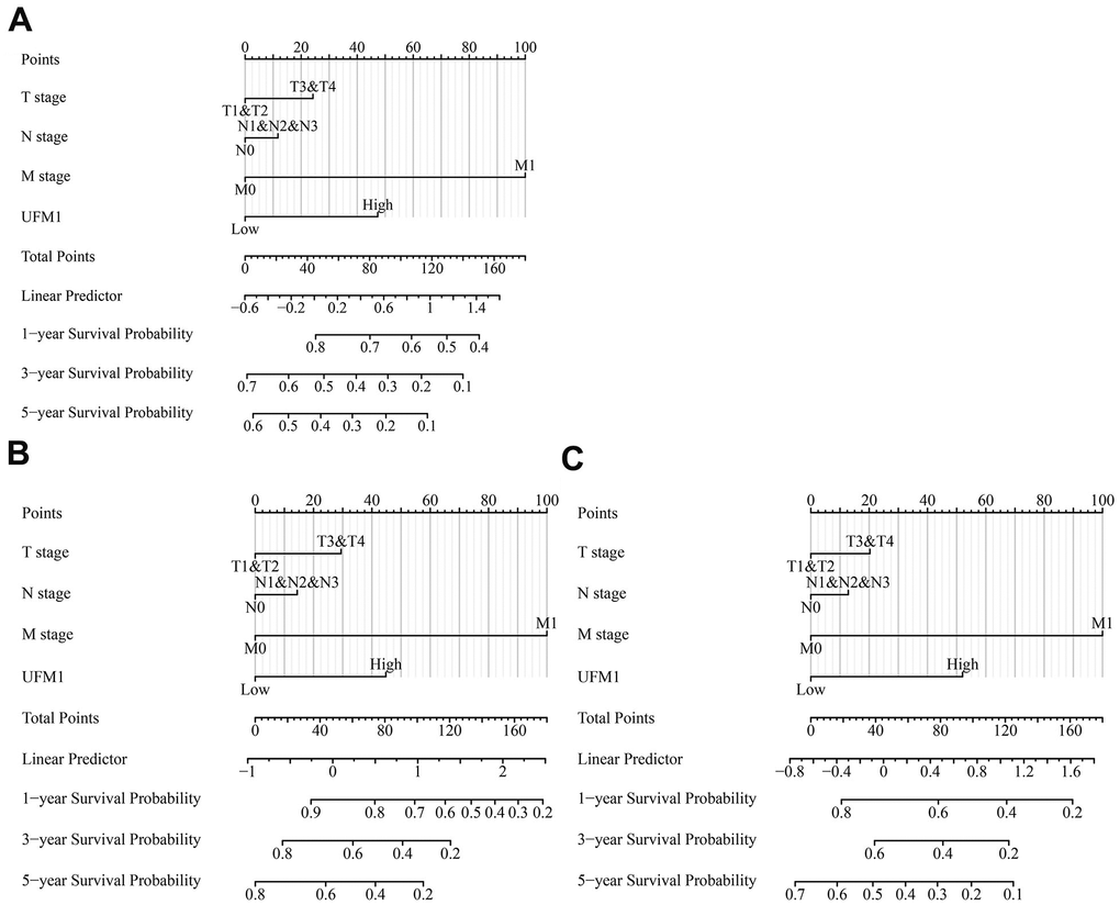 Univariate Cox regression analysis depicted that UFM1 overexpression was an influencing factor of poor prognosis indicators OS, DSS and PFI in OSCC patients (Tables 2–4). In addition, N stage was also an influencing factor for DSS and PFI in OSCC patients (Tables 3, 4). T, N, and M stages were risk factors for dismal prognosis in OSCC patients. Therefore, we constructed the nomograms of the T, N, and M stages and UFM1 expression levels (Figure 7).