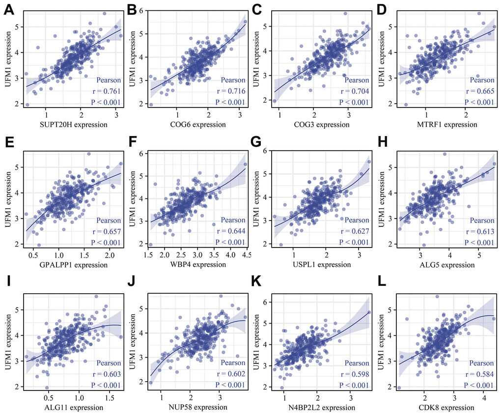 There were 148 UFM1 positively correlated co-expressed genes (Table 5). In the David database, KEGG analysis showed that UFM1 co-expressed genes involved the autophagy, Biosynthesis of nucleotide sugars, Metabolic pathways, Amino sugar and nucleotide sugar metabolism, and N-Glycan biosynthesis B signal mechanism (P <0.05). In addition, Figure 8 showed that UFM1 was significantly correlated with the expression levels of SUPT20H, COG6, COG3, MTRF1, GPALPP1, WBP4, USPL1, ALG5, ALG11, NUP58, N4BP2L2, and CDK8.