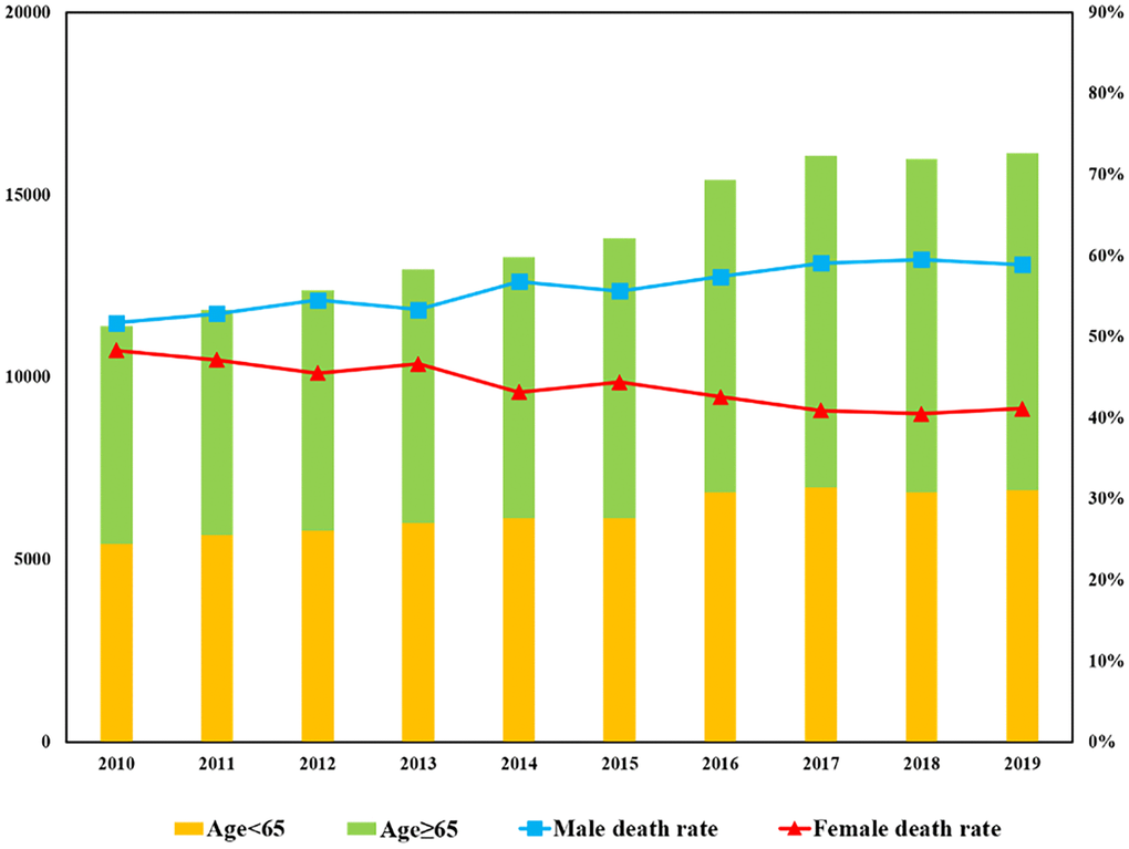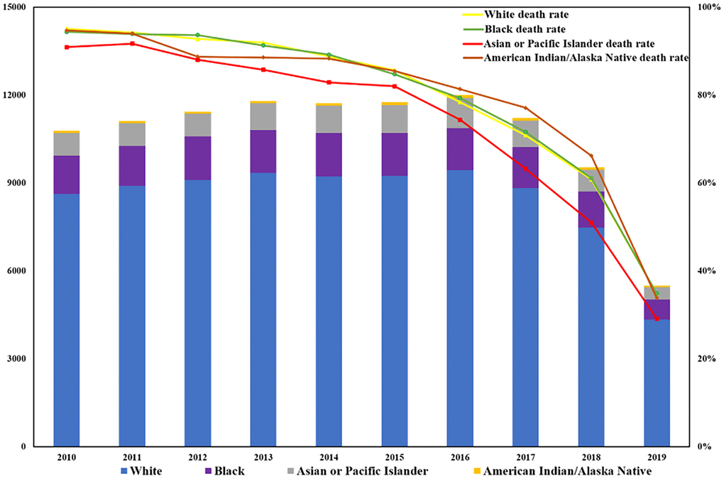 The number of patients with BM has been increasing annually, rising from 11,408 cases in 2010 to 16,138 cases in 2019 representing a significant overall increase of 41.43%. The proportion of those aged ≥ 65 has been growing significantly faster than those under 65. From 2010 to 2019, the proportion of people aged ≥ 65 increased from 52.4% to 57.2%, as shown in Figure 1. It can be observed that in patients with BM, the proportion of male patients has also increased considerably, from 51.7% to 58.9%, while the female proportion has decreased from 48.3% to 41.1%. In addition, for pan-cancer patients who were with BM, the death tolls among different races have shown an upward trend followed by a downward trend over the past decade (see Figure 2). However, the mortality rate in each race has decreased year by year, with the largest ethnic group being white, which has experienced a significant decrease from 95.1% in 2010 to 34.8% in 2019.