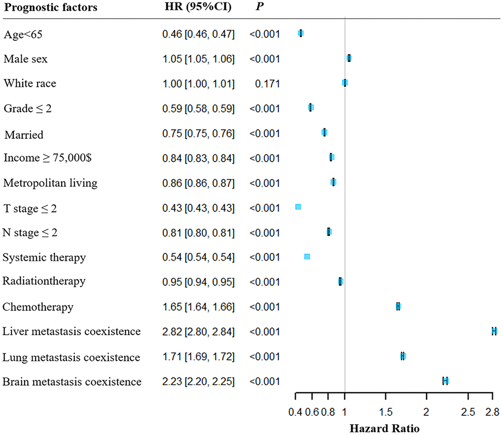 The multivariable Cox regression analysis indicated that age < 65, primary cancer grade ≤ 2, married status, household income ≥ $75,000, T & N stages ≤ 2, and experiences with systemic and radiation therapy were associated with better survival rates for patients with BM. Conversely, male sex, chemotherapy experience, and coexisting liver, lung, and brain metastasis were associated with poorer survival rates for patients with BM. A forest plot was generated to illustrate the detailed hazard ratio (HR) and 95% confidence intervals (CIs) for each covariate (as shown in Figure 5).