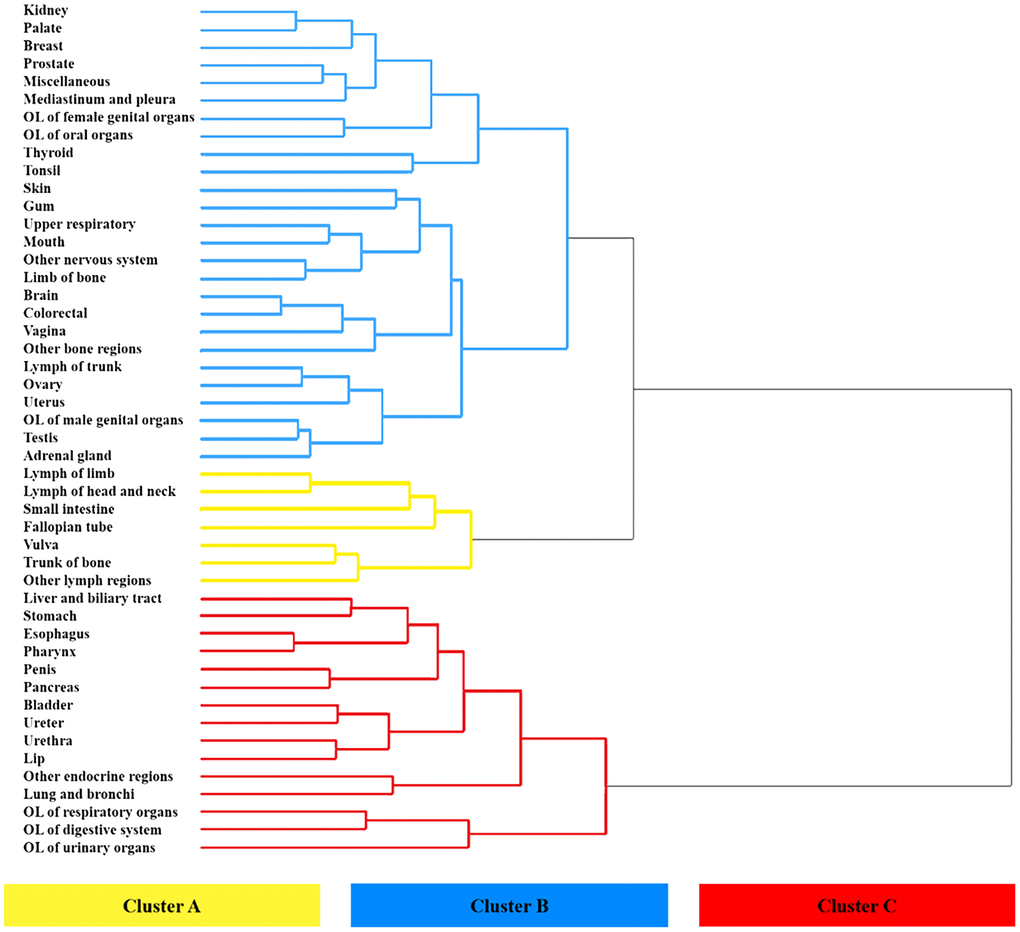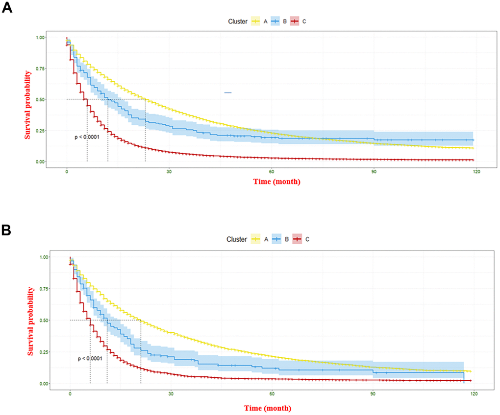 The overall primary cancer sites (n = 48) in this study were classified into three clusters, namely A, B, and C, based on dendrogram from hierarchical clustering. The prognostic trend of each cluster can be clearly seen in Figure 6. Cluster A, which is marked in yellow in the figure, showed relatively best prognoses. This cluster comprises cancers that developed in the lymph nodes of the limb, head and neck, and other lymph regions, as well as those that occurred in the small intestine, fallopian tube, vulva, and bone trunk. Cluster C (marked in red) included cancers that originated from OL of respiratory, urinary, and digestive systems, lung and bronchus, lip, pancreas, esophagus cancers, etc. were observed the worst prognosis. The Kaplan-Meier curve were used to demonstrate the mean survival time for each category (as shown in Figure 7A). In the construction group, the mean survival time for clusters C, B, and A were 6.13 ± 0.16 months, 12.02 ± 0.09 months, and 22.95 ± 0.13 months, respectively. Similarly, in the validation group, the mean survival times were 5.92 ± 0.08 months, 11.01 ± 0.16 months, and 20.86 ± 0.07 months, respectively for cluster C, B and A (Figure 7B). Significant differences were observed in between the clusters in the construction as well as validation cohort (P<0.0001).