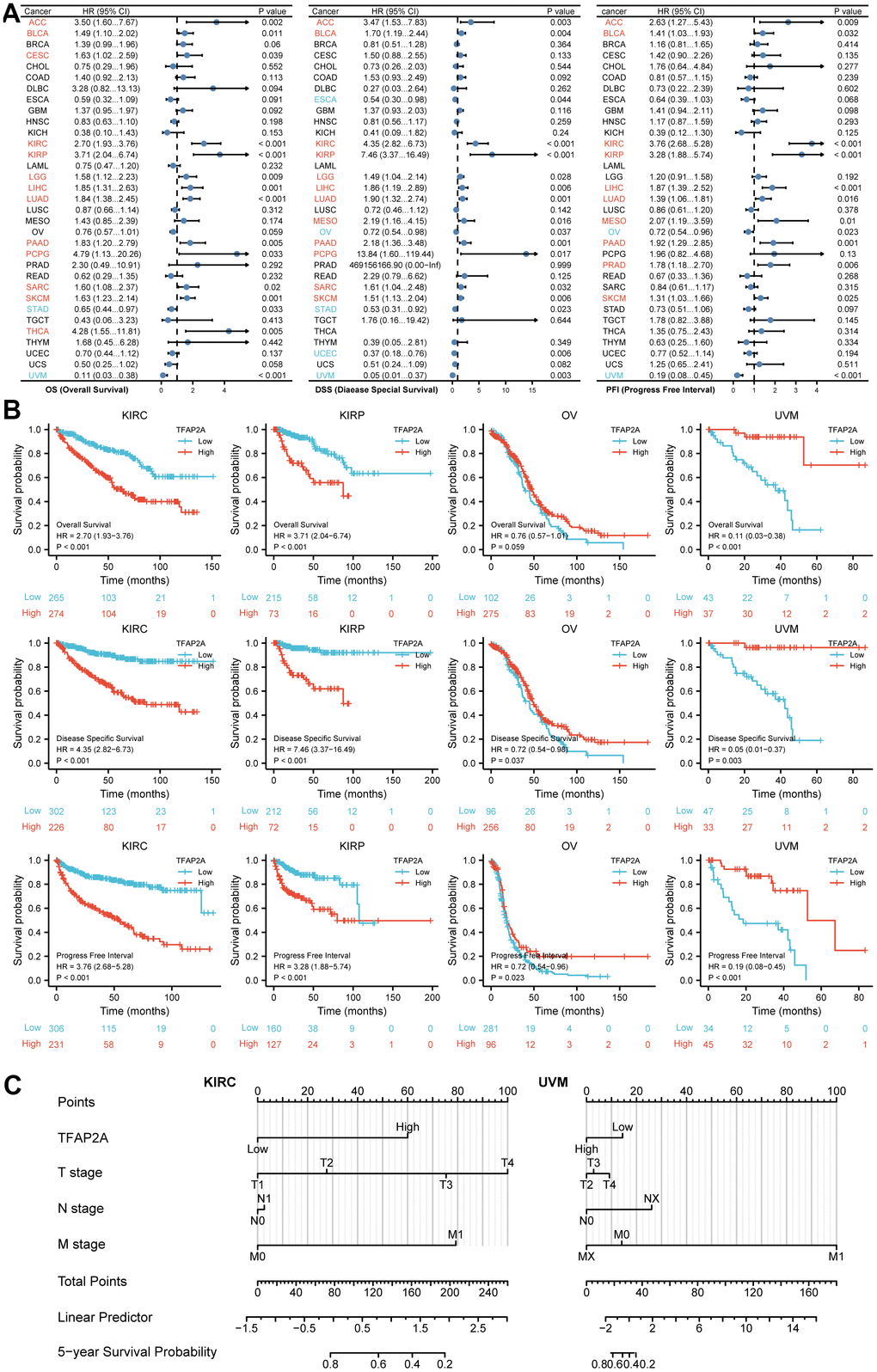 To investigate the possible role of TFAP2A in clinical prognosis, we examined the data from the TCGA database to identify the co-relationship between TFAP2A expression with prognosis utilizing Cox regression analysis. The outcomes included OS, DSS, and PFI in many types of cancers. Results indicated that TFAP2A was positively associated with the HR in KIRC and KIRP yet negatively associated with Ovarian serous cystadenocarcinoma (OV) and UVM (Figure 2A), which would be further studied. Subsequently, higher TFAP2A expression was correlated with worse outcomes in KIRC and KIRP (HR>1). While in OV and UVM (HR<1), the reverse applied (Figure 2B). Kaplan-Meier survival curves of other human cancers were also displayed in Supplementary Figures, OS, DSS, and PFI were included (Supplementary Figure 2A–2C). Next, KIRC (HR>1) as well as KIRP (HR<1) were chosen to establish Nomogram prognostic model, respectively, which directly predicted 5-year survival probability. Consistent with previous results, higher expression of TFAP2A in KIRC was significantly associated with shorter survival whereas higher expression of TFAP2A in KIRP was significantly associated with longer survival. Ultimately, both Cox regression analysis and Nomogram prognostic model manifested that TFAP2A could be a valuable and worthy prognostic factor.