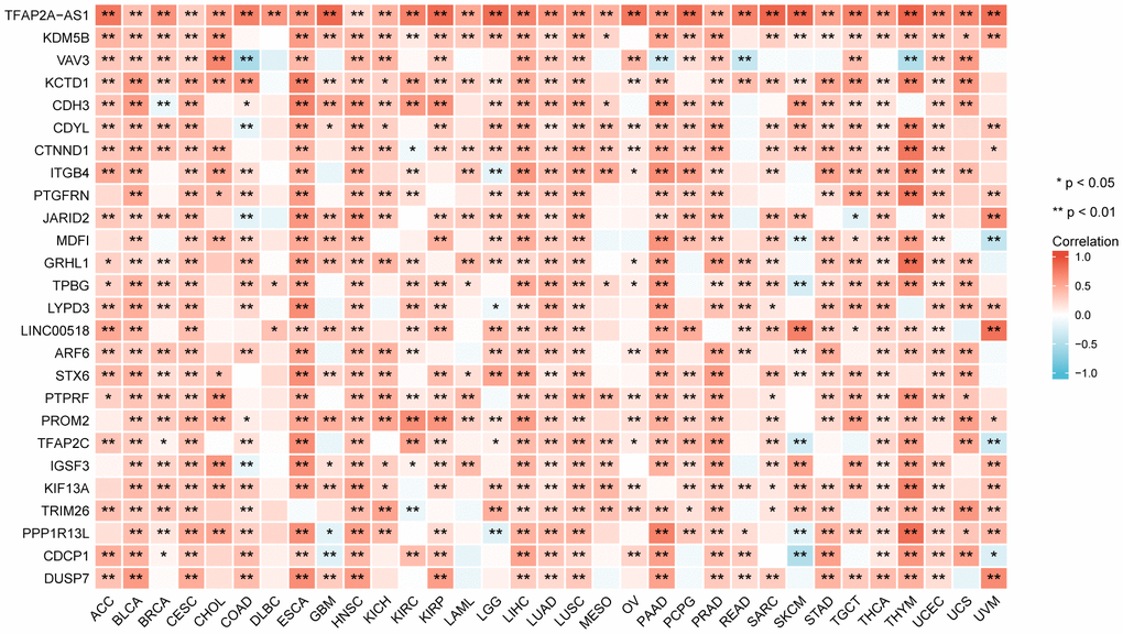 TFAP2A gene correlation analysis in pan-cancer