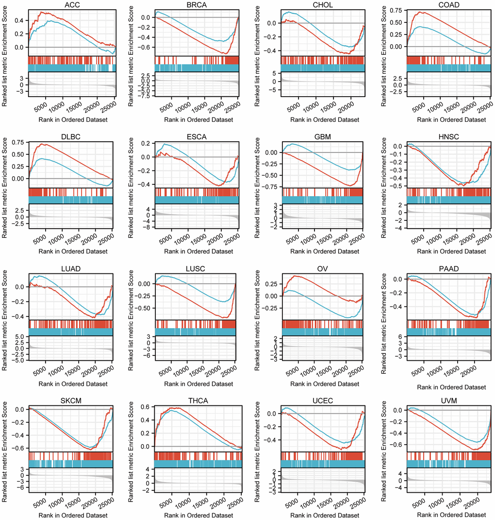 After enrichment analysis of genes co-expressed with the TFAP2A, we carried out GSEA to analyze genes that exist expression differences between low and high TFAP2A expression groups (Figure 5). Among 33 cancer types, 16 of them significantly enriched in specific pathways (p-value < 0.05 and FDR < 0.25), and we further prioritized them in each cancer type according to the absolute Normalized enrichment score (NES). Through comprehensive consideration, two of the most common and relevant pathways are “GPCR LIGAND BINDING” and “IMMUNOREGULATORY INTERACTIONS BETWEEN A LYMPHOID AND A NON-LYMPHOID CELL”. The data suggested that TFAP2A positively regulated “GPCR LIGAND BINDING” signaling pathways in Adrenocortical carcinoma (ACC), COAD, Lymphoid neoplasm diffuse large B-cell lymphoma (DLBC), OV, and THCA. TFAP2A negatively regulated “IMMUNOREGULATORY INTERACTIONS BETWEEN A LYMPHOID AND A NON-LYMPHOID CELL”, related to the control of immunological response, in BRCA, CHOL, ESCA, GBM, HNSC, LUAD, LUSC, OV, Pancreatic adenocarcinoma (PAAD), SKCM, UCEC, UVM. These results suggested TFAP2A had a complex regulation in pan-cancer.