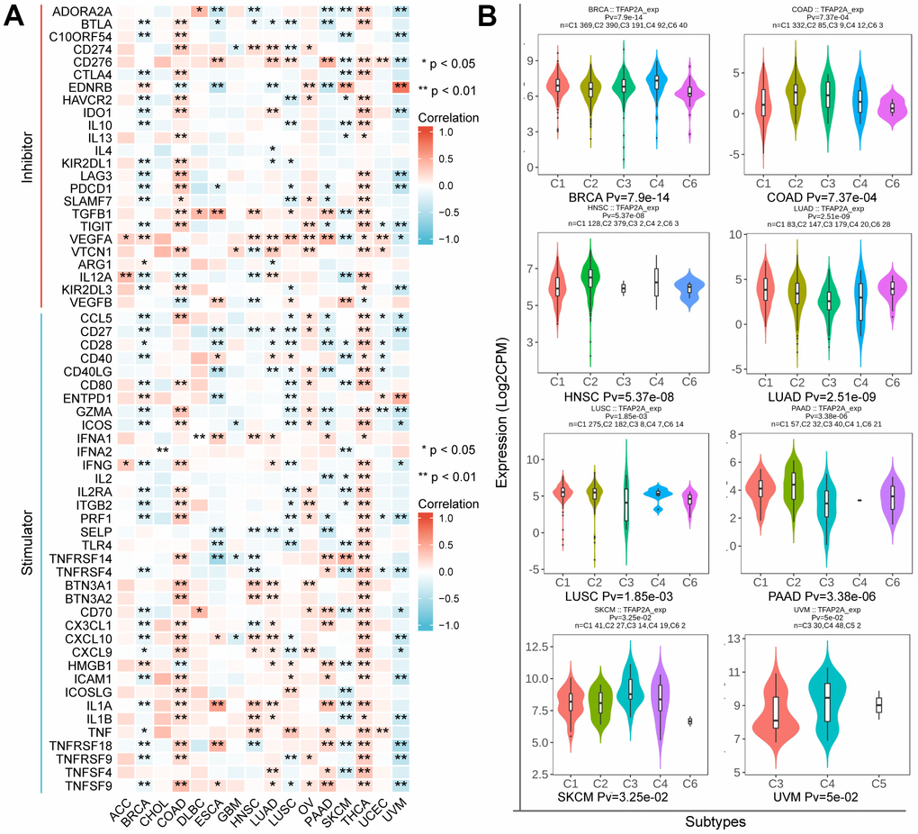 Immune subtypes were classified into six types, including C1 (wound healing), C2 (IFN-γ Dominant), C3 (inflammatory), C4 (lymphocyte depleted), C5(immunologically quiet), and C6 (TGF-β dominant) [25]. TFAP2A expression was closely correlated with immune subtypes in BRCA, COAD, HNSC, LUAD, LUSC, PAAD, SKCM, and UVM (Figure 6B). Considering the results, we made the assumption that TFAP2A could have an immune-related function in pan-cancer based on the aforementioned findings.