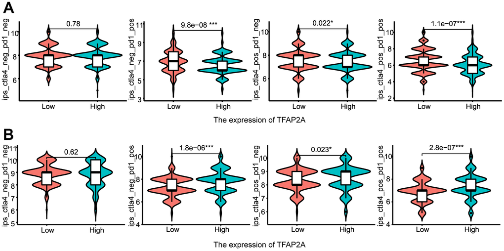 To evaluate the effect of TFAP2A expression on predicting immunotherapy efficacy, we extracted the calculated Immunotherapy Scores of PD-1 or CTLA4 blockade treatment from TCIA (http://tcia.at/) [28]. We separated samples into two groups according to TFAP2A expression and integrated them with immunotherapy scores data using the R-package “limma”. We used the R-package “ggpubr” for results visualization.