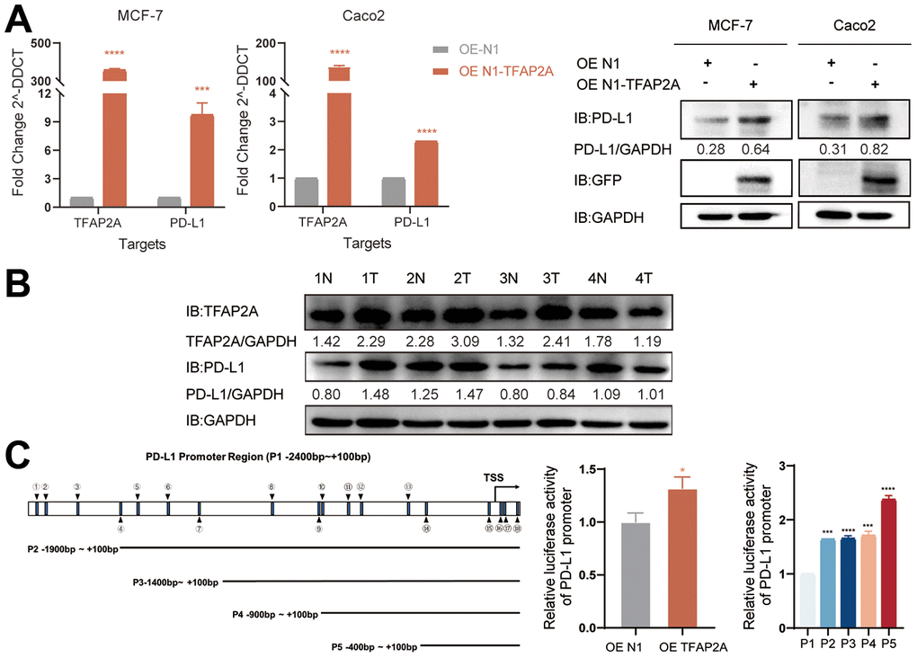 4 pairs of colon tissue samples and adjacent normal colon tissue samples were collected to investigate the expression of TFAP2A and PD-L1. The protein levels of TFAP2A were elevated in three tumor tissue samples compared to the adjacent normal tissues. While one out of four tissues didn’t match the previous results. Overall, these results indicated that TFAP2A expression was positively correlated with PD-L1 expression in most of fresh colon tissues.